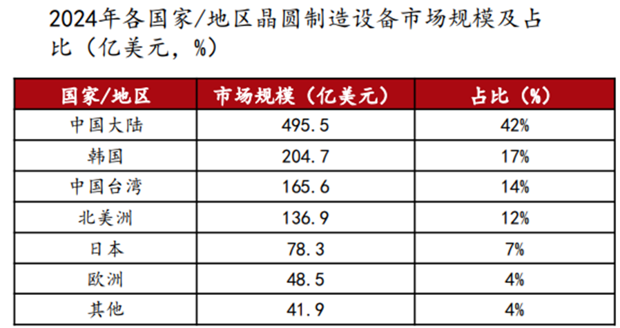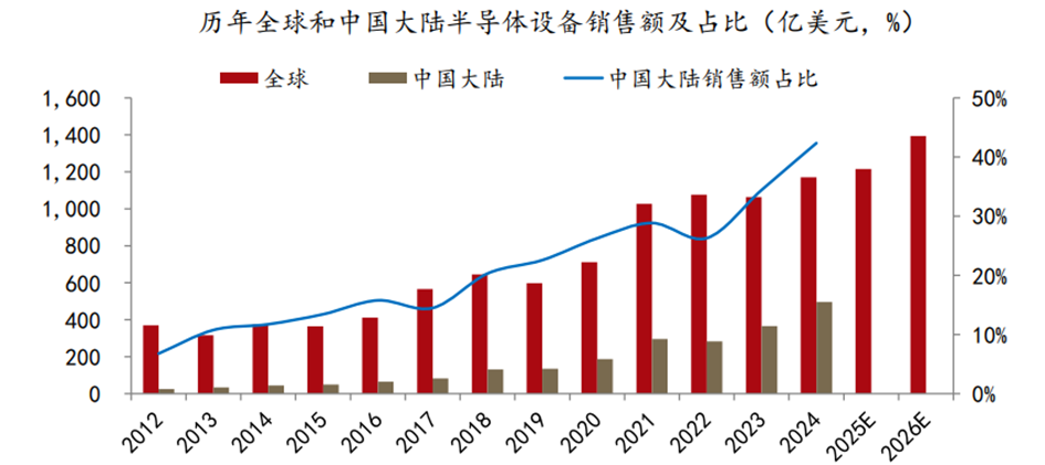 近年来先进制程与封装需求持续释放,国产半导体设备在技术验证、客户导入与订单转化等方面加速推进,国产替代进程全面提速。根据SEMI数据,2024年全球半导体设备销售额为1171亿美元,同比增长10%,未来有望保持增长态势。其中,2024年中国大陆半导体设备销售额为495.5亿美元,同比增长35%;占比达42%,同比提升7.85个百分点,创历史新高,连续五年成为全球最大半导体设备市场。