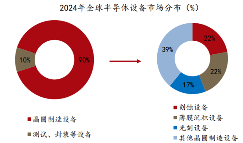相比后道环节,前道晶圆制造技术难度更高,涉及工艺更繁杂,涵盖光刻、刻蚀、薄膜沉积等工艺,因此所需设备价值量更高、种类更多。SEMI数据显示,2024年晶圆制造设备市场规模约占半导体设备总市场规模的90%。