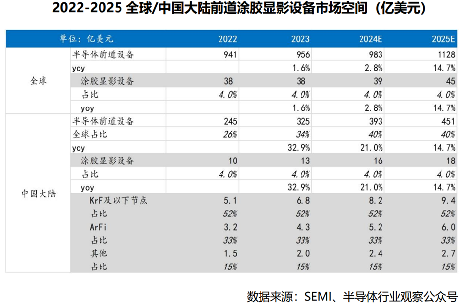 受益于市场景气度复苏影响,晶圆厂资本开支增加,产能逐步扩张,为涂胶显影设备等半导体设备厂商带来良好机遇。根据国海证券研究所测算数据,2022/2023/2024/2025年全球前道涂胶显影设备市场空间为38/38/39/45亿美元,2025年中国大陆前道涂胶显影设备市场空间预计将达到18亿美元,约合130亿元;其中,2025年中国大陆KrF及以下节点、ArFi、其他涂胶显影设备市场空间为9.4/6.0/2.7亿美元。