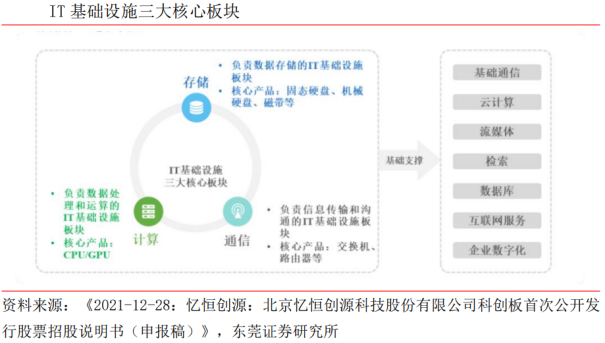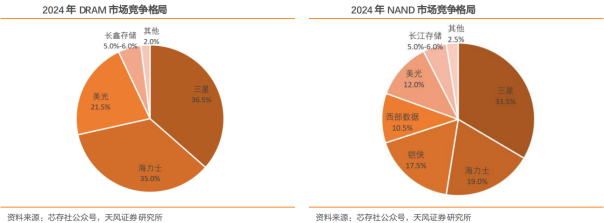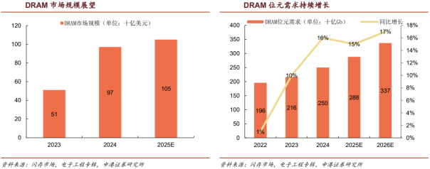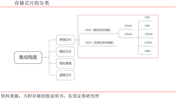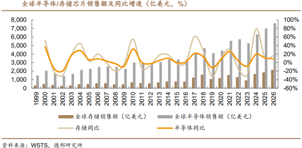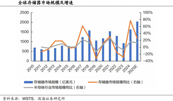 存储器是数字信息的载体,是IT基础设施三大核心板块之一。半导体存储器也叫存储芯片,是指利用磁性材料或半导体等材料作为介质进行信息存储的器件,其存储与读取过程体现为电荷的贮存或释放。它是电子系统中存储和计算数据的载体,是应用面最广、市场比例最高的集成电路基础性产品之一。据忆恒创源招股说明书,IT基础设施总体分为计算、存储和通信三大板块,分别以处理器、存储器、交换机/路由器等为核心产品。数字经济的发展与IT基础设施产业互为表里、相辅相成,而存储板块在数字经济的发展中具备先导性和需求刚性,数字经济规模的高速增长推动存储行业蓬勃发展。存储器构成集成电路的重要组成部分。市场规模方面,据WSTS,2024年全球半导体市场规模为6305.49亿美元,同比增长19.7%,其中集成电路市场规模为5395.05亿美元,占比达85.6%。存储器作为集成电路重要分支,2024年市场规模为1655.16亿美元,同比增长79.3%,占集成电路比重达30.68%。存储器分类:易失性存储、非易失性存储。按照是否需要持续通电以维持数据,半导体存储器可分为易失性存储和非易失性存储。其中易失存储芯片主要包含静态随机存取存储器(SRAM)和动态随机存取存储器(DRAM);非易失性存储器主要包括可编程只读存储器(PROM),闪存存储器(Flash)和可擦除可编程只读寄存器(EPROM/EEPROM)等。易失性存储:主要指随机存取存储器(RAM),需要维持通电以临时保存数据供主系统CPU读写和处理。由于RAM可以实现对数据的高速读写,因此通常作为操作系统或其他正在运行中的程序的临时数据存储媒介。RAM根据是否需要周期性刷新以维持数据存储,进一步分为动态随机存取存储器(DRAM)和静态随机存取存储器(SRAM)。动态随机存取存储器(DRAM)需要在维持通电的同时,通过周期性刷新来维持数据,故称“动态”存储器。DRAM结构简单,因此单位面积的存储密度显著高于SRAM,但访问速度慢于SRAM;此外,由于DRAM需要周期性刷新以维持正确的数据,因此功耗较SRAM更高。DRAM作为一种高密度的易失性存储器,主要用作CPU处理数据的临时存储装置,广泛应用于智能手机、个人电脑、服务器等主流应用市场。非易失性存储:主要指只读存储器(ROM),无需持续通电亦能长久保存数据。早期的ROM产品信息首次写入后即固定下来,以非破坏性读出方式工作,只能读出而无法修改或再次写入信息,故称“只读”存储器。ROM经过不断演变发展,经过掩膜只读存储器(Mask ROM)、可编程只读存储器(PROM)、可编程可擦除只读存储器(EPROM)、电可擦除可编程只读存储器(EEPROM)和快闪存储器(Flash)等阶段,已经突破原有的“只读”限制。存储芯片相比其他半导体品种周期性较强,一般以3-4年为一个周期。以2023-2024年为例,2023年存储芯片市场规模为923亿元,同比下滑29%,2024年市场规模为1655亿元,同比增长79%;相比之下2023-2024年半导体总体市场规模增速为-8%/20%。同时,存储厂商自身毛利率变动也非常明显,以存储大厂美光、海力士为例,两家厂商23Q1、23Q2毛利均为负数,而2025年海力士毛利率修复到50%以上,美光毛利率则接近40%。相关人士认为,存储行业的强周期性主要有以下几个原因:技术端:产品标准化程度高。存储器的代际标准一般以JEDEC固态技术协会标准为主,核心指标包括电压、传输频率、存储容量等。以JEDEC最近发布的LPDDR6标准为例,LPDDR6采用双子通道架构,可实现灵活的操作,同时保持32字节的小访问粒度,同时采用比LPDDR5更低电压、低功耗的VDD2电源供电。因此,各家存储厂商同代产品性能差距不会特别大,使得存储芯片具有一定大宗商品属性。存储行业为寡头市场,全球市场基本被3-5家大厂垄断。根据TrendForce,DRAM市场被三星、海力士、美光三家垄断,25Q2CR3份额超过90%;Nand Flash市场主要供应商有三星、海力士、凯侠、美光、闪迪,25Q2CR5份额超过90%。大厂的扩产或减产对整体行业影响较大。存储的主要下游是手机、PC等消费电子,这些行业本身就具有周期属性,例如2020-2021年手机,笔记本电脑等销量增长明显,而2022-2023年间销量有所下滑。从2016年开始,存储行业经历了三轮周期。总体来看,2016-2019年周期核心受益DDR4换代带来的价格快速上涨;2020-2023年周期核心受益笔记本电脑/手机等消费电子产品需求增长;2024年开启的新周期核心受益AI基建带来的需求增长。2016-2017年,尽管手机、PC等消费电子产品销量并无明显增长,但手机游戏等应用的火爆对硬件内的存储性能提出了更高的要求。以手机游戏为例,根据CINNIC,2016/2017年中国手机网络游戏用户分别增长26%/16%至3.52/4.07亿人,手机游戏对手机的处理器芯片和内存芯片提出更高的要求。同时,内存正在从DDR3时代过度到DDR4时代,下游应用的需求推动DDR4渗透率大幅提升。原厂方面,2016年存储厂转向3D Nand Flash扩产,加深了市场对于DDR4供给紧张的预期。同时2016年三星西安工厂停电等厂务因素也进一步推高存储器价格。2020-2021年,随着全球受到疫情影响,远程办公、线上网课等形式逐渐普遍,带动笔记本电脑、手机销量大幅增长,其中笔记本电脑出货量在2020年大幅增长27%。另外全球数据中心建设对服务器需求也有所提升,根据IDC,2020/2021全球服务器出货量分别增长3.9%和6.9%。2022-2023年消费电子销量有所下滑,存储景气度开始下行。2024年开始,海内外大厂对AI服务器的需求增加了存储芯片的出货,同时高性能的AI服务器又需