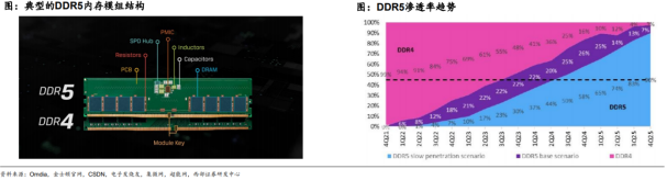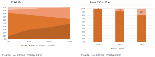 在NAND Flash领域,3D堆叠技术已成为提升存储密度的主要手段。2023年开始,各大厂商正式突破 200层,三星推出第八代236层、海力士推出了238层、美光推出了232层, 铠侠推出218层的NAND Flash产品,长江存储推出232层颗粒固态硬盘。 随着应用领域和使用场景越来越多样化,特别是AI的推动,市场对NAND Flash的要求也随之提升,对容量的要求越来越高。比如2024年,手机主流的存储容量也到了256GB至1TB之间。因此,在2025年,三星、SK 海力士、美光、铠侠、西部数据、长江存储等这些NAND Flash的头部企业的目标瞄准了300 层的3D NAND Flash商用化。三星甚至宣称将在2030年推出1,000层的NAND Flash产品。DRAM制程已进入10nm以下节点,美光的1γ(12nm)技术率先量产,使DDR5速度达到9200MT/s,功耗降低20%。三星和SK 海力士也在积极推进1α(14nm)和1β(13nm)工艺。不同DRAM 类型针对特定场景优化:DDR5适用于服务器和PC,LPDDR5X专注移动设备低功耗,GDDR6X满足图形处理需求,而 HBM则专攻AI高带宽应用。国内长鑫存储已推出LPDDR5芯片。3、DDR5、PCle 5.0 SSD、QLC 渗透率提高DDR5作为DDR4的迭代产品,在性能、能效和架构上实现了显著提升。DDR5的每引脚数据传输速率比其前代DDR4翻了一番,初始DDR5将提供50%的带宽增加,达到4.8 GT/s。 随着时间的推移,DDR5内存最终将扩展到高达8.4 GT/s。此外,DDR5的工作电压从1.2V降至1.1V,结合DIMM集成的电源管理IC(PMIC),进一步优化了功耗控制。在架构方面,DDR5采用双通道设计,每个通道40位(32数据位 8 ECC位),相比DDR4的单一72位通道,显著提高了内存访问效率。同时,DDR5支持更高的芯片密度(单颗64Gb,DDR4仅16Gb),使得单条DIMM容量可达256GB,为数据中心和AI服务器提供了更强的扩展能力。 在PC DRAM上LPDDR5X和DDR5将成为主要应用,其中LPCAMM2 这些形态的存储产品也将提供更多选择。在SSD上,随着先进制程的PCIe5.0主控芯片由12nm制程演进至5/6/7nm的先进制程,采用四通道DRAM-less的设计可达到超10GB/s的连续读取性能,使得功耗和散热得到有效缓解,预计PCIe5.0方案将在2026年的消费类市场上得到普及。LPDDR5X方面,GRACE CPU预计推动2025同比增长427%。QLC方面,产出将持续增长,预期2025年 QLC手机存储渗透率达到21%。目前HBM 已发展至HBM3E和HBM4阶段,SK海力士占据HBM3 85%的市场份额,其12层HBM4样品已开始送样。HBM的关键挑战在于热管理,2019年,SK海力士推出了新型 封装技术MR-MUF应对HBM产品热量过高的问题。美光的HBM3E产品通过优化堆叠结构,已经实现了功耗降低30%的技术突破。在空间互联方面,随着TSV技术不断成熟,未来HBM4的封装方案将借助更先进的微间距互联技术,实现10μm甚至更小间距的精密互联,从而大幅提升内存模块的集成度和带宽密度。在DDR5的基础上,MRDIMM(多路复用双列直插内存模块)进一步提升了内存带宽, 成为应对“内存墙”问题的关键技术。MRDIMM沿用了类似LRDIMM的“1 10”架构(1颗 MRCD 10颗 MDB),通过同时操作两个内存通道,将数据速率提升至 8800MT/s(第一代)甚至12800MT/s(第二代)。例如,英特尔至强 6处理器搭配 MRDIMM后,性能提升高达33%。此外,高尺寸(TFF)MRDIMM无需增加物理插槽即可扩展容量,适用于2U及以上服务器。目前,英特尔、AMD、SK海力士等厂商已推出相关产品,而国内澜起科技也在MRCD/MDB 芯片领域占据重要地位。随着AI算力需求的增长,MRDIMM有望成为高性能计算和AI训练的主流内存方案。