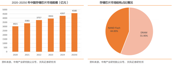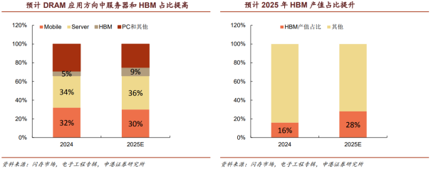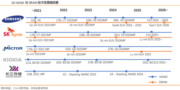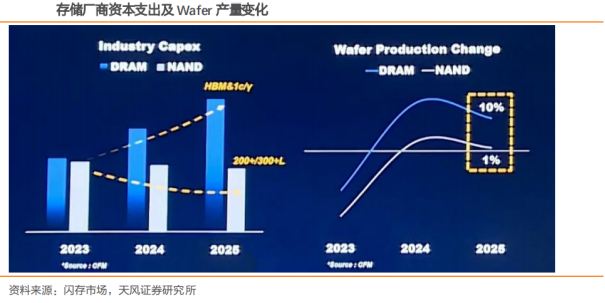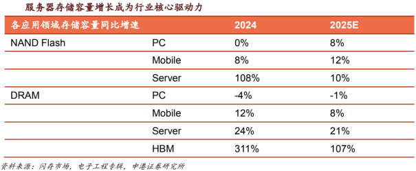 根据中商产业研究数据显示,2023年中国半导体存储器市场规模约为3943亿元,2024年约为4267亿元,预计2025年市场规模将达4580亿元。目前存储芯片市场主要以DRAM和NAND Flash为主。其中,DRAM市场规模最大,占比约为55.9%,NAND Flash占比约为44.0%。存储芯片是典型的寡头垄断市场,长期由韩美企业主导,国内企业近些年占比持续提升。DRAM存储器市场份额高度集中,主要被三星、SK海力士和美光三者垄断。根据芯存社数据,2024年三家企业市场份额分别为36.5%、35%和21.5%,竞争格局稳定,国内存储厂商长鑫存储的市场份额约为5%-6%。NAND Flash全球市场2024年前五企业分别为三星(33.5%)、SK海力士(19%)、铠侠(17.5%)、美光(12%)、西部数据(10.5%)。国内存储厂商长江存储作为后进者,在2024年达到了约5%-6%的市场份额。根据闪存市场邰炜表示,在供应端,从各大存储原厂的财报都可看出,存储原厂基于稳住价格跌幅、保证利润的策略重心,减少旧产能、聚焦先进制程产品的生产以及技术的迁移。整个资本支出将更多投入到更先进封装或研发上,更侧重于HBM、1c、1γ和200层、300层这些先进产能。而整体wafer产出相比以往的增量将减少很多。在技术路线上,NAND将继续朝更高堆叠发展,2025年将进入300层以上的时代,同时混合键合技术已经成为NAND Flash重要的技术发展方向,存储原厂持续通过优化技术架构和材料,克服超高层NAND Flash的量产挑战。在DRAM方面,2025年更会看到在1c、1γ这些DRAM制程上的演进。HBM4量产:计划2025年下半年量产HBM4,并预计2026年开始商业供应。DRAM扩产:在韩国华城和平泽工厂扩建1cDRAM(第六代10nm级)产线。三星2025年稍早已在平泽第四园区(P4)启动首条1cDRAM制程技术产线,目标月产能为3万片晶圆。之后若继续扩产顺利,月产能将有望提升至4万片。技术调整:退出消费端MLCNAND闪存业务,转向TLC/QLCNAND。HBM4布局:计划10月量产12层HBM4,单封装容量36GB,良率突破70%。产能收缩:2025年上半年NAND减产10%,聚焦高附加值产品。外包策略:将HBM2封装外包给力成科技,腾出产能专注HBM3E/HBM4研发。技术突破:联合AsteraLabs展示PCIe6.0SSD样品,将SSD性能提升至27GB/s的新水平。产能提升:2025年DRAM晶圆投片量预计达273万片(同比 68%),可能达到SK海力士50%产能。AI算力投资和端侧应用需求延续,带动存储位元需求扩容。随着AI训练和推理对算力需求的快速增长,数据中心对HBM、大容量DDR5及企业级SSD的存储需求同步增加,AI与云服务成为存储需求核心驱动力。根据金融界援引Bloomberg数据,2025年Meta、谷歌、亚马逊和微软合计资本开支预计达2972亿美元,同比增长36.8%。微软在2024财年基础设施投资已超800亿美元,并明确未来三年保持同等投资强度,重点覆盖AI算力需求。国内方面,云服务商和电信运营商算力资本开支有望维持和加码,根据财联社消息,阿里巴巴宣布未来三年将投入3800亿元用于云和AI基础设施。另外,根据IT之家及腾讯控股2024年第四季度及全年业绩交流会消息,腾讯资本开支连续四个季度实现同比三位数增长,2024年度突破767亿元,同比增长221%,创下历史新高,公司2024年资本开支占营收比例12%,2025年指引为低双位数。中国联通年报显示,公司2024年算力投资同比上升19%,2025年算力投资预计同比增长28%,公司预计固定资产投资在人民币550亿元左右,加快推进IDC向AIDC、通算向智算升级。根据闪存市场预测数据,DRAM位元需求2025/2026年分别有望同比增长15%/17%,NAND位元需求2025/2026年分别有望同比增长12%/15%,同比增速较2024年有望加速。服务器市场已成为存储产业发展的核心驱动力。根据闪存市场数据,受益于AI的带动,服务器市场已经成为存储需求发展的核心驱动力,2024年服务器NAND的容量高增108%,而服务器DRAM和HBM分别增长24%和311%,手机和PC市场相比2024年也将有所增长。2025年服务器整机出货量预计将继续增长至1330万台,其中AI服务器占比将达到14%,进一步推高服务器的存储配置。服务器平台迭代带动存储产品加快升级。闪存市场数据显示,在CPU的支持和训练效率提升作用下,2025年部分厂商的服务器PCIe5.0的搭载率将达到30%。在服务器DRAM方面,随着后期AMD图灵平台的上市,预计6400MT/s的96GB/128GB的DDR5在服务器市场将会迎来放量增长。同时,英伟达GPU架构由Hopper转向Blackwell的再次升级,在2025年将带动HBM从HBM3正式进入HBM3E,而在2026年HBM4的出现也会带来更多定制化需求。行业龙头美光调高2025年HBM市场规模展望至350亿美元。根据闪存市场消息,美光发布FY2025Q2财季业绩后表示近期其大型超大规模客户重申了在2025年资本投资将实现同比强劲增长。预计2025年服务器出货量将实现中个位数百分比增长,传统服务器和AI服务器均将实现增长。公司预计2025年HBM总市场规模将达350亿美元以上,比之前预估的300亿美元有所提高,并预计2025年第四季度有望HBM份额达到与整体DRAM供应份额相当的水平。公司表示其2025年HBM已售罄,2026年HBM市场需求将保持强劲态势。目前公司已开始批量生产HBM3E12H,预计2025年下半年HBM3E12H将占HBM总出货量的绝大部分、HBM4将于2026年实现量产。大容量存储需求使QLC产能占比提高,技术进步为存储产业带来新增长机遇。AI的发展带动存储容量迅速扩张的同时,也对存储性能提出更高要求,如大容量存储的需求使得QLC时代提前到来。据闪存市场预计,2025年QLC产能占比将接近20%,并且在企业级SSD的大规模量产以及手机存储的突破性应用方面展现