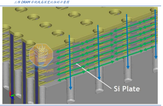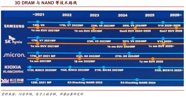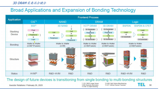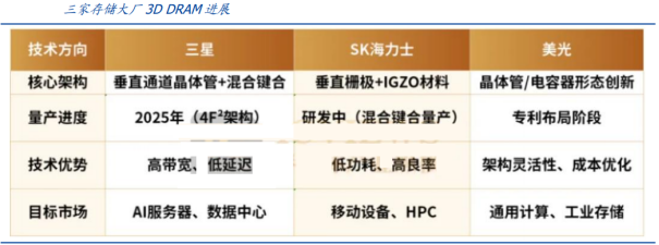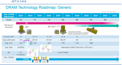 各大DRAM厂商不断升级DRAM制程,但平面形式下进一步缩小制程已接近极限。从各厂商制程节奏来看,十纳米级DRAM有第一代1x((18~19nm)、第二代1y((17~18nm)、第三代1z((16~17nm)、第四代1α或1a((14~15nm)、第五代1β或1b((12~13nm)、第六代1γ或1c((11~12nm)、第七代1δ或1d((10~11nm)、第八代1ε((10nm)。其中,三星在1x、1y和1z制程技术领先,并在1a采用EUV,但美光延续采用DUV机台,反而抢先量产1a和1b制程。目前1c制程竞争激烈,美光已送样1γDDR5,只用一层EUV加速量产并降低成本;SK海力士1c制程2025上半年量产,应用于DDR5、LPDDR6、GDDR7等;三星的1c制程可能2025年下半年量产。预计2027年左右将量产第七代1d制程、2028年之后将量产第八代1ε制程。然而,随着物理极限的逼近,出现电流泄漏、信号干扰等问题,进一步缩小变得非常困难。4F²结构为3D DRAM重要技术方向。为实现有限面积的高效利用,存储单元布局需突破传统水平排列模式,核心路径分为两类:一是将单元结构垂直化以压缩占用空间,二是借鉴建筑堆叠逻辑实现单元阵列的立体排布。其中,4F²结构是单元垂直化的关键技术方案,4F²结构的技术核心在于重构存储单元的内部组件布局,将传统水平分布的源极、栅极与漏极转化为垂直层级结构。具体而言,其结构设计遵循自上而下的层级逻辑:最底层设置与位线连接的源极,源极上方部署连接字线的栅极,栅极之上再依次堆叠漏极与电容器。这种垂直堆叠的单元架构不仅能大幅降低组件间的电气干扰,还能将单个单元的面积缩减约三分之一,为高密度集成奠定基础。从技术对比视角来看,传统DRAM单元阵列采用源极、栅极、漏极(含电容器)的横向排列方式,而4F²结构则通过自上而下的垂直堆叠重新定义单元形态。在空间占用上,传统结构需依托位线占据3个单位空间,4F²结构则仅需2个单位空间,这使得在相同面积内可集成的存储单元数量显著提升。当前,该技术路线已成为行业重要研发方向,三星正在开发的垂直通道晶体管(VCT)DRAM,以及SK海力士推进的垂直栅极(VG)DRAM,均以4F²结构为核心技术架构。高深宽比蚀刻与沉积设备厂商或将受益于3D DRAM产业变革。从3D DRAM的工艺流程来看,交替沉积硅/锗硅多层结构(类似全环绕栅晶体管初始工艺);蚀刻隔离柱孔并填充介质,形成位线绝缘支撑结构;蚀刻位线/电容器阵列通孔;选择性去除锗硅牺牲层,悬空硅层作为沟道;沉积氮化层包裹沟道,填充绝缘材料防漏电;临时填充电容器孔,在位线通孔内蚀刻形成栅极/字线;金属填充位线通孔,替换电容器孔填料为电容介质。我们看到,图形化步骤大幅精简,高难度蚀刻/沉积工序显著增加。二维NAND曾是光刻精度竞赛的主战场,其存储单元平面微缩需求远超DRAM与逻辑芯片。但转向三维架构后,NAND通过堆叠层数实现密度跃升,受益者是材料工艺设备商。3D DRAM的产业变局下相关设备厂商或将受益,产业价值正在从光刻设备向蚀刻/沉积设备迁移。行业推测可能采用深冷蚀刻(纵向) 湿法蚀刻(横向)的复合工艺方案。3D DRAM亦增加W2W键合需求,预计bonder市场规模2030年达3000亿日元。在4F²和3D DRAM中,有一项重要技术是将控制电路(周边电路,如感应放大器、WL驱动器、解码器等)垂直堆叠,芯片(Die)的面积可以进一步缩小,就需要将绘制有DRAM单元阵列的晶圆和绘制有控制电路的晶圆分开制作,再进行晶圆对晶圆(W2W)键合或混合键合(Hybrid Bonding)。根据TEL,W2W混合键合将用于内存中的3DDRAM,东京电子预计,bonder机的市场TAM将从2025年的1000亿日元增加到2030年的3000亿日元。三星VCTDRAM预计最快在未来两到三年内实物产品将正式面向市场。Memcon2024期间,三星正式发布基于垂直通道晶体管(VCT)技术的3DDRAM开发路线图,致力于在2030年前完成量产完善型3DDRAM的技术落地与产能搭建。与此同时,据韩国媒体报道,三星半导体(DS)部门管理层已针对VCTDRAM制定明确的量产路线图,且相关筹备工作已正式启动。从现有DRAM产品迭代节奏来看,三星电子当前正推进第五代10纳米级DRAM的量产工作;在产品规划层面,其已确定2025年启动第七代10纳米级DRAM的开发工作,并最终明确将VCTDRAM技术定为第八代DRAM产品的核心开发方向。对于VCTDRAM的商业化进程,业界普遍预计最快在未来两到三年内,该技术的实物产品将正式面向市场。海力士展示5层堆叠结构的3D DRAM原型产品,良率达56.1%。SK海力士在VLSI2024大会上,对外展示了采用5层堆叠结构的3DDRAM原型产品,并同步宣布该原型已实现56.1%的良率;其发布的相关研究论文进一步指出,实验过程中的3D DRAM原型展现出与当前市场主流2D DRAM相近的运行特性。此外,SK海力士正同步推进将IGZO材料应用于3DDRAM的技术研究,旨在通过材料创新解决3DDRAM在带宽与延迟方面面临的技术挑战。IGZO材料是由铟、镓、氧化锌组成的金属氧化物材料,主要分为非晶质IGZO与晶化IGZO两大类;其中,晶化IGZO具备物理与化学性质双重稳定的特点,在半导体制造工艺环节中能够保持结构的均匀性,而SK海力士当前重点研究的正是这类晶化IGZO材料。该材料的最大技术优势在于低待机功耗,这一特性与对续航时间有较高要求的DRAM晶体管需求高度适配,可有效改善DRAM的刷新特性,为3D DRAM性能优化提供关键支撑。美光3D DRAM专利布局积极,技术路径为在不放置Cell的情况下改变晶体管和电容器的形状。美光2019年就开始了3D DRAM的研究工作,截止2022年8月,美光已获得了30多项3D DRAM专利,是三星