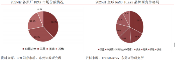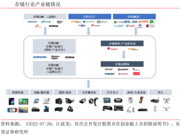 存储器产业链情况:原厂掌握产业链核心技术,并推动技术迭代与标准制定。据江波龙招股说明书,存储器产业链从上至下分别为:晶圆厂、主控芯片、封装测试、存储模组与产品供应商、存储品牌商、下游具体应用场景等。其中,上游晶圆厂即存储“原厂”,是业内对具备自有晶圆制造能力的存储芯片厂商的通称,掌握核心颗粒(Die)的制造权,如三星、美光、海力士、长鑫存储等。原厂拥有晶圆制造能力,掌握制程工艺、架构设计等核心技术,是存储芯片性能、寿命、功耗等指标的决定者,同时控制着行业最关键的产能资源。此外,原厂还推动行业技术迭代与标准制定,新一代存储技术(如3D NAND层数提升、DRAM制程升级、接口标准变更)通常由原厂率先研发并量产,其强话语权决定了产业升级节奏和方向。行业集中度极高,海外大厂掌握行业话语权。存储晶圆的设计与制造产业具有较高的技术和资本门槛,早期进入存储器领域的全球领先企业通过巨额资本投入不断累积市场优势,全球存储晶圆市场份额被韩、美、日等国家的少数企业主导。相比海外领先大厂,我国存储器相关产业起步较晚,尽管近年来在半导体产业政策和资本支持下,以长江存储、长鑫存储为代表的国内晶圆厂商在技术、产能方面实现突破,但市场份额与海外头部企业仍存在较大差距。DRAM方面,根据CFM闪存市场数据,在AI需求爆发与高价值产品渗透的双重推动下,2025年第二季度全球DRAM市场实现量价齐升,二季度市场规模环比增长20%至321.01亿美元,同比增长37%,创历史季度新高。市场份额方面,行业市场份额从高到低依次为:SK海力士(韩国,38.2%)、三星(韩国,33.5%)、美光(美国,22.0%)和南亚科(中国台湾,1.1%),行业前三市场份额合计达93.7%。NAND Flash方面,据Trendforce,2025年第一季度全球前五大NAND Flash品牌商合计实现营收120.2亿美元,合计市场份额达91.3%。行业前五均为美、日、韩企业,市场份额从高到低依次为:三星(韩国,31.9%)、SK集团(韩国,含海力士和SK思德,16.6%)、美光(美国,15.4%)、铠侠(日本,14.6%)和闪迪(美国,12.9%)。主要晶圆厂仍采用IDM模式运营,部分原厂向下游存储产品渗透。不同于逻辑芯片从IDM模式向产业链分工模式切换,半导体存储器由于布图设计与晶圆制造结合更为紧密,业内主要晶圆厂仍采用IDM模式运营。此外,由于存储晶圆标准化程度高,应用场景所需的功能在NAND Flash主控芯片设计、固件开发以及SiP封装等产业链后端环节实现,因此存储原厂完成晶圆制造后,仍需开发大量应用技术以实现从标准化存储晶圆到具体存储产品的转化。存储原厂通过规模效应锁定大客户,保证产能的高效利用。作为存储产业链中下游,目前业内的存储模组厂商可分为大型IDM厂(即原厂)和第三方独立模组供应商。从服务客户类型来看,存储原厂掌握晶圆制造、设计和封测全流程,规模效应显著,主要覆盖大宗市场和大型客户,如智能手机、PC、服务器、数据中心等整机厂商或全球头部OEM/ODM客户,通过大批量出货来摊薄成本。由于这类客户出货规模巨大且产品标准化程度高,通常能与原厂形成长期稳定的采购与议价关系,保证原厂产能的高效利用。第三方独立模组深耕广泛细分市场,满足中小客户定制化需求。相比大型存储原厂,第三方模组厂商缺乏晶圆制造能力,而是从三星、美光、SK海力士等原厂采购DRAM/NAND颗粒,再搭配主控芯片与PCB封装为标准化或定制化模组产品(如SSD、U盘、内存条等)。由于难以与原厂在大客户市场进行正面竞争,模组厂通常通过灵活的小批量、多品类产品切入市场,更多聚焦于消费电子配件、工控、安防、车载电子、渠道分销等细分领域,以满足下游细分客户充分且广泛的定制化需求。第三方模组厂商的核心价值在于系统集成能力与良好的响应机制,而非底层制造。一般来说,原厂的性能与定位偏高端,客户数量有限但体量庞大,而模组厂虽然技术壁垒低于原厂,但需要具备出色的BOM控制、颗粒筛选、固件调校与测试验证能力,以及较强的交付、品质与售后响应机制。总而言之,存储模组厂核心在于“颗粒之外”的增值,如系统集成、固件优化、产品化能力与交付服务,是典型的下游价值实现环节。模组厂需从原厂采购晶圆,晶圆价格变动对公司盈利能力影响较大。由于第三方模组厂商并不自建晶圆厂,因此依赖原厂的产能与定价。以国内老牌存储模组龙头企业江波龙为例,据公司招股说明书,公司从全球及国内领先的晶圆原厂采购存储晶圆,从知名的存储主控厂商采购主控芯片,在采购完成原材料后,通过委外方式进行产品生产过程中所需的封装测试、组装加工等。从成本占比来看,存储晶圆成本占公司主营业务成本比重约75%-80%,因此存储晶圆价格变动对毛利率影响较大。模组厂的成本变化具有滞后性。在存储行业,模组厂商的产品单位成本变化通常滞后于产品的销售单价变化,主要原因在于晶圆采购到产品销售之间存在时间间隔。当存储价格上涨时,模组销售单价先于成本上升,模组企业的毛利率短期走高,价格下跌时则相反。由此可见,晶圆的价格波动会以一定时滞传导至成本端,形成模组厂盈利能力的周期性波动。