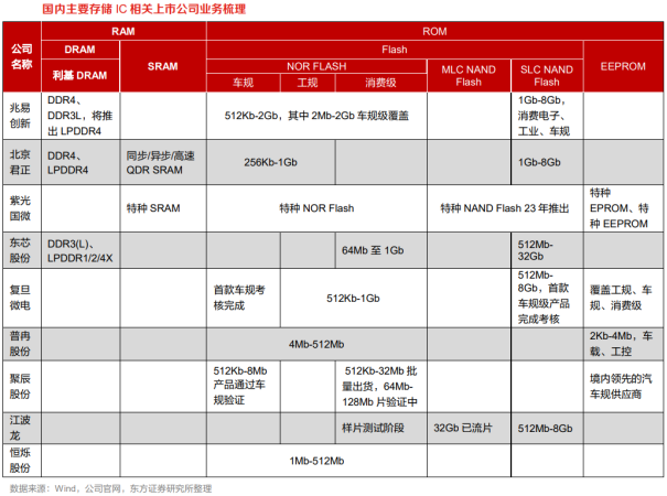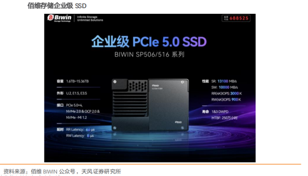 江波龙专注于半导体存储领域,为客户提供从产品设计、存储芯片、主控芯片设计及固件开发,到封装、测试、制造等全方位的存储定制服务。国产替代龙头,企业级存储实现放量增长。2025H1公司企业级存储业务规模增长明显,企业级存储业务收入达到6.93亿元,同比增长138.66%。公司是国内少数具备“eSSD RDIMM”产品设计、组合以及规模供应能力企业,在eSSD与RIDMM产品组合基础上,已成功点亮SOCAMM产品,结合MRDIMM、CXL2.0内存拓展模块构建了全面的企业级产品体系。公司的eSSD与RIDMM产品已成功完成鲲鹏、海光、飞腾等多个国产CPU平台服务器的兼容性适配,DDR5RDIMM产品也通过了AMD旗下Threadripper PRO 9000 WX系列工作站CPU认证,为在主流平台上的广泛应用提供了坚实的技术基础。公司企业级业务进入快速增长阶段,客户涵盖运营商、大型及中型互联网企业、服务器企业等,产品已在通信、互联网、金融等行业历经多次严苛考验并成功交付。主控自研修筑技术壁垒,TCM模式不断突破,加码长期高毛利高壁垒。截至2025年7月底,公司主控芯片全系列(含UFS\eMMC\SD\高端U盘等场景)产品累计实现超过8000万颗的批量部署。公司设计并成功流片了历史上首批UFS自研主控芯片,搭载公司自研主控的UFS4.1产品的整体性能超越市场同类产品。基于公司UFS主控芯片的技术实力优势,公司已与闪迪达成战略合作,共同面向移动及IOT市场推出定制化的高品质UFS产品及解决方案。2、佰维存储:产品布局与AI战略深度融合,SSD技术领先佰维存储专注于半导体存储器的研发设计、封装测试、生产和销售,核心产品及服务涵盖半导体存储器和先进封测服务,具体可分为六大产品线:嵌入式存储、PC存储、工车规存储、企业级存储、移动存储和先进封测服务。公司企业级存储有4大类别,分别为SATASSD、PCIe SSD、CXL内存及RDIMM内存条,主要应用于数据中心、通用服务器、AI/ML服务器、云计算、大数据等场景。公司SS系列企业级2.5"SATASSD产品包含SS811、SS821等系列,支持异常掉电保护、端到端的数据保护、Thermal Throttling、动态和静态磨损平衡、支持电源动态管理、S.M.A.R.T、垃圾回收和TRIM、固件备份、Internal RAID等特性。公司SP系列企业级PCIe SSD产品,包含Gen4和Gen5两类产品。用创新架构,可实现超低且一致的读写延迟,具备优秀的能效比表现,可为客户提供业界领先的KIOPS/Watt综合性能。 3、兆易创新:利基存储格局优化,端侧AI推动定制化需求增长公司专用型存储芯片包括NOR Flash、SLC NAND Flash和利基型DRAM三条产品线,形成了丰富的产品矩阵,满足客户在不同应用中对容量、电压以及封装形式的多元需求,已在消费电子、工业、通讯、汽车电子等领域实现了全品类覆盖。NOR Flash方面,公司产品覆盖512Kb到2Gb的容量范围,支持1.2V、1.8V、3V、1.65~3.6V以及1.8 VVCC&1.2VVIO等多种供电类型,并针对不同市场应用需求分别提供高性能、低功耗、高可靠性、小封装等多个产品系列,可满足客户在不同应用领域多种产品应用中对容量、电压以及封装形式的需求。2025年上半年,公司推出了专为1.2VSoC应用打造的双电压供电SPI NOR Flash产品,进一步强化公司在双电压供电闪存解决方案领域的战略布局,为市场提供先进嵌入式存储解决方案,可应用于智能可穿戴设备、医疗健康、物联网、数据中心及边缘人工智能等新兴领域。2025年,公司为率先实现45nm节点SPI NOR Flash大规模量产的公司之一,存储密度得到显著改善,持续保持技术和市场的领先。SLC NAND Flash方面,公司产品容量覆盖1Gb~8Gb,采用3V/1.8V两种电压供电,具有高速、高可靠性、低功耗的特点,其中SPI NAND Flash在消费电子、工业、汽车电子等领域已经实现了全品类的产品覆盖。2025年上半年,公司推出了兼备更快读取速度和坏块管理功能的高速QSPI NAND Flash产品,可应用于工业、IoT等快速启动应用场景。公司利基型DRAM产品广泛应用于网络通信、电视、机顶盒、智能家居、工业等领域。2025年上半年,公司8Gb容量DDR4产品市场推广顺利进行,营收稳步增长;LPDDR4产品开始贡献营收。公司控股子公司青耘科技开展的定制化存储业务正有序推进中,业务进展顺利。4、德明利:国内存储模组领先厂商,企业级存储打开成长空间公司产品线涵盖固态硬盘、嵌入式存储、内存条及移动存储四大系列,已广泛应用于车载电子、数据中心、新能源汽车、手机、平板、安防监控等多元应用场景。公司以闪存主控芯片的设计、研发为差异化核心竞争力,结合固件方案及量产工具开发、存储模组测试和供应链管理等形成完善的存储解决方案,公司目前研发量产了多款存储主控芯片,最终通过存储模组产品形式实现销售。2024年公司实现营业收入47.73亿元,同比增长168.74%;实现归母净利润3.51亿元,同比增长1302.30%。企业级SSD方面,公司面向高性能应用领域推出了M.22280NVMePCIe5.0x4SSD,顺序读写性能达到14100/12200MB/s,容量规格设定为1TB-8TB,显著降低数据传输的延迟,内置智能电源管理模块,确保在高性能运行的同时保持低功耗和高稳定性,广泛支持AI 技术,满足大数据、云计算和高性能计算的存储需求。公司正在加快推进产品研发与客户验证工作,目前已给多家云服务企业进行送样,部分产品已顺利通过客户验证并成功导入。5、香农芯创:构建“分销 产品”一体两翼发展格局,企业级存储有望成为新增长点公司在高端存储领域历经多年耕耘,现已