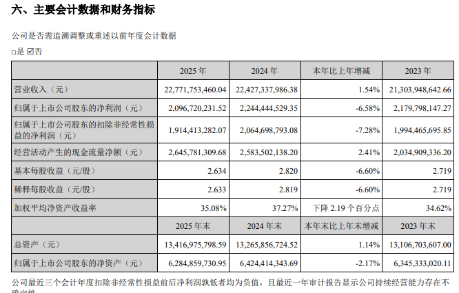 高比例分红的同时,苏泊尔的整体经营基本保持稳定。2025年,公司实现营业收入227.72亿元,同比增长1.54%;归母净利润20.97亿元,同比下降6.58%。