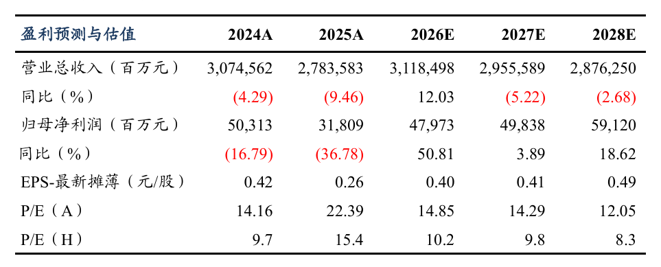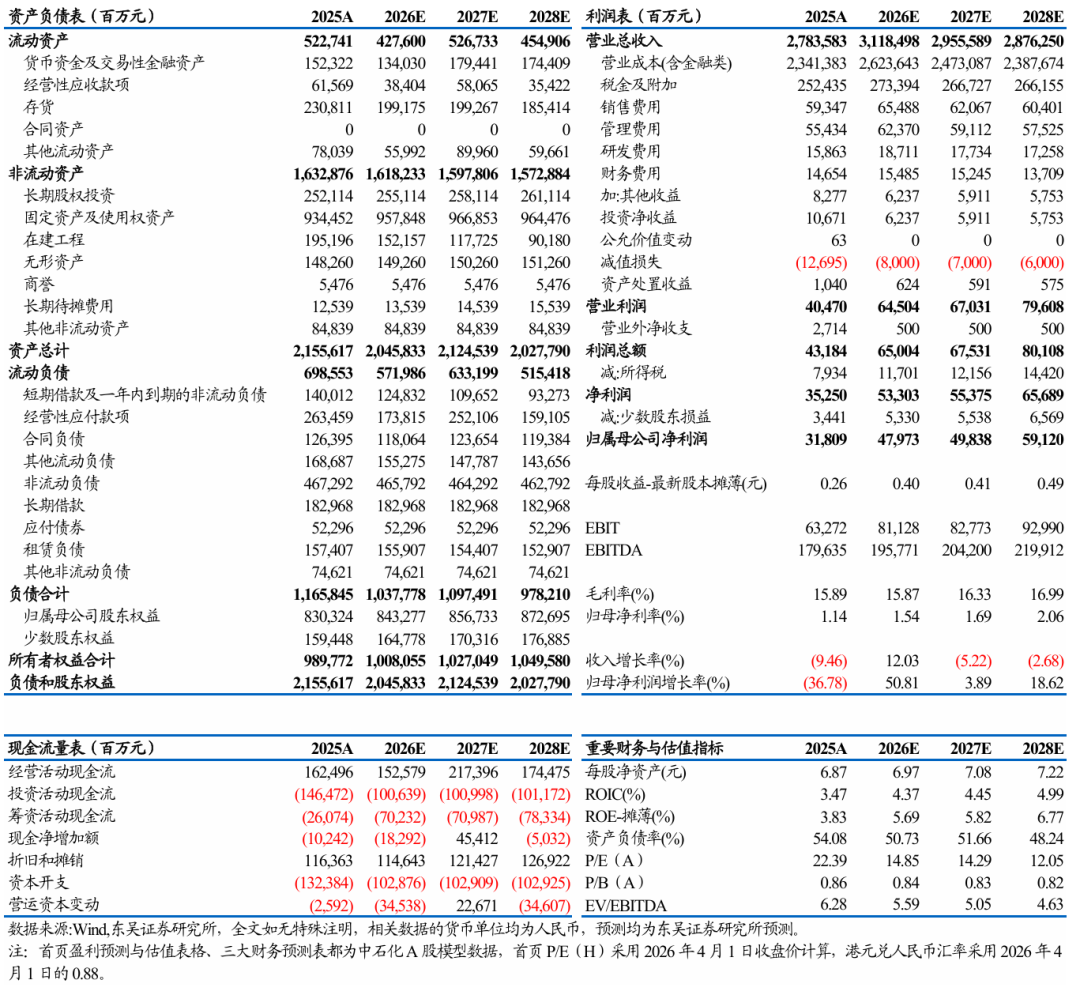 事件:1)2025年油价下行叠加库存减利,经营业绩承压。近期公司发布2025年年报,实现营业总收入27,835.83亿元,同比-9.46%;实现归母净利润318.09亿元,同比-36.78%;实现经营活动现金流净额1,624.96亿元,同比 8.8%。公司业绩低于我们预期,主要系炼化业务需求疲软,以及炼化装置、长期股权投资等减值增加。2)2026Q1,中东地缘冲突导致油价和石脑油等价格大幅上涨,成本支撑下,成品油及化工品价格也出现不同程度的上涨。中国石化是我国炼油能力最大的炼化企业,在油价高位震荡的情况下,炼油与化工业务盈利呈现阶段性波动特征。