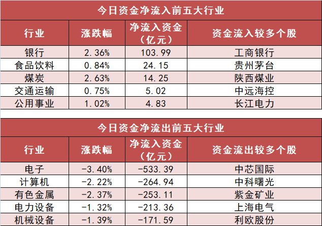 申万一级行业中,6个行业实现资金净流入,其中银行业净流入103.99亿元居首。