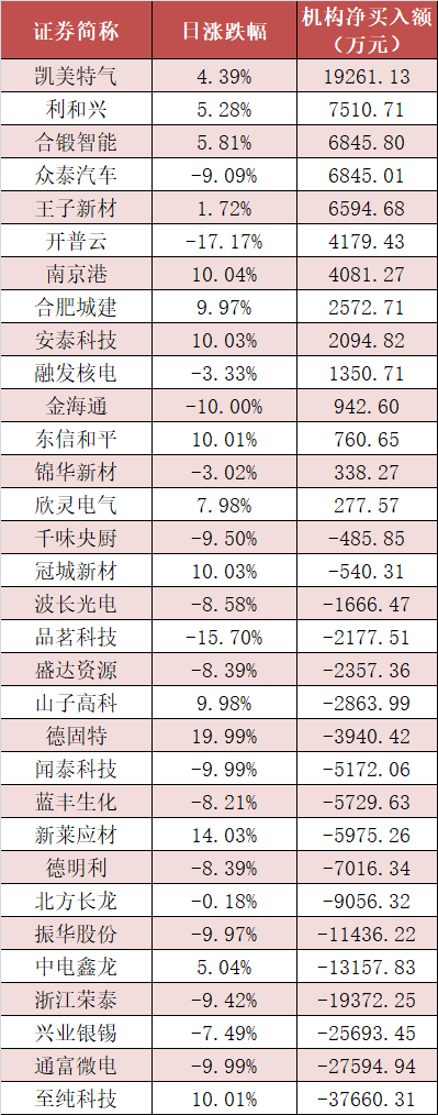 盘后龙虎榜数据显示,机构现身多股,其中凯美特气等股票呈现机构资金净买入,至纯科技等股票呈现机构资金净卖出。