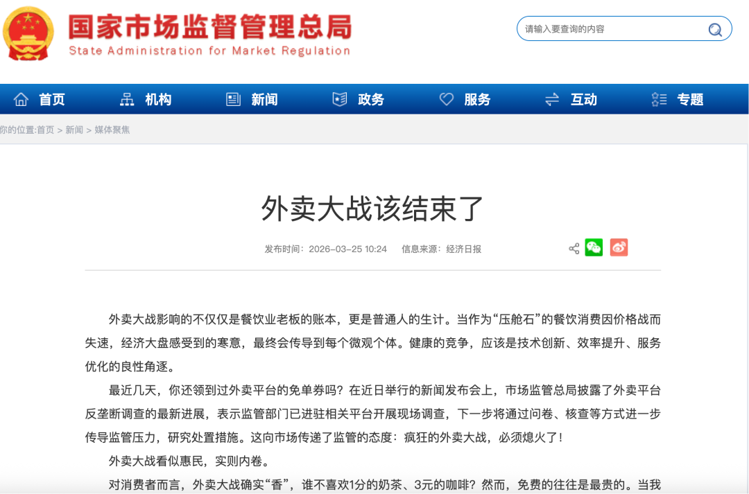 更具象征意义的是,在美团财报发布前一天,国家市场监督管理总局转发了经济日报题为《外卖大战该结束了》的文章,此举被市场解读为监管层面释放出明确信号,将对行业内非理性价格竞争予以叫停。