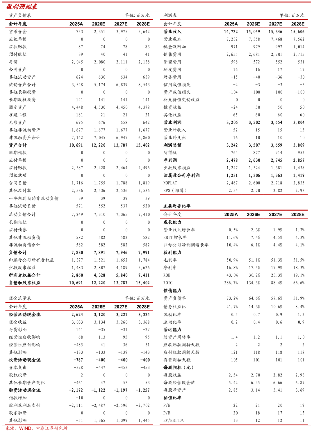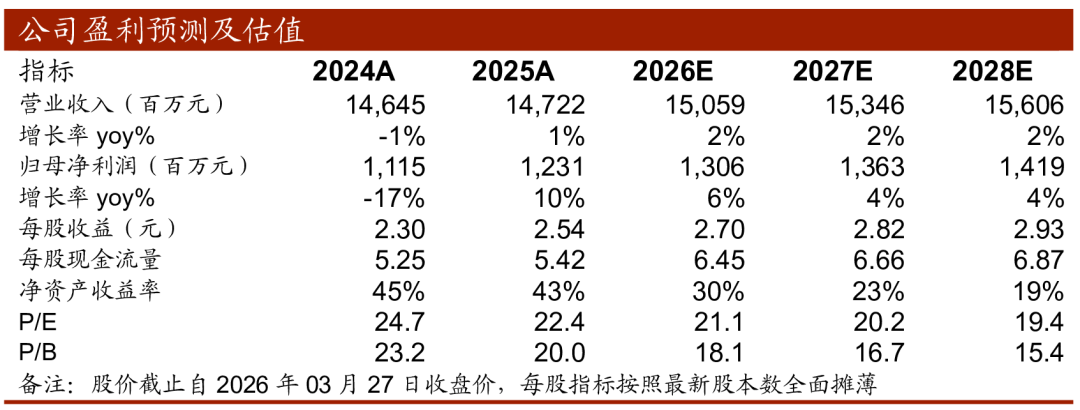 盈利预测:结合公司2025年实际业绩情况,我们调整盈利预测,预计公司 2026-2028年收入分别为150.6、153.5、156.1亿元(2026-2027年前值为151.36、155.02亿元),同比增长 2.3%、1.9%、1.7%,归母净利润分别为13.1、13.6、14.2亿元(2026-2027年前值为12.72、13.11亿元),同比分别增长 6%、4%、4%,对应 PE 为21倍、20倍、19倍,维持“买入”评级。