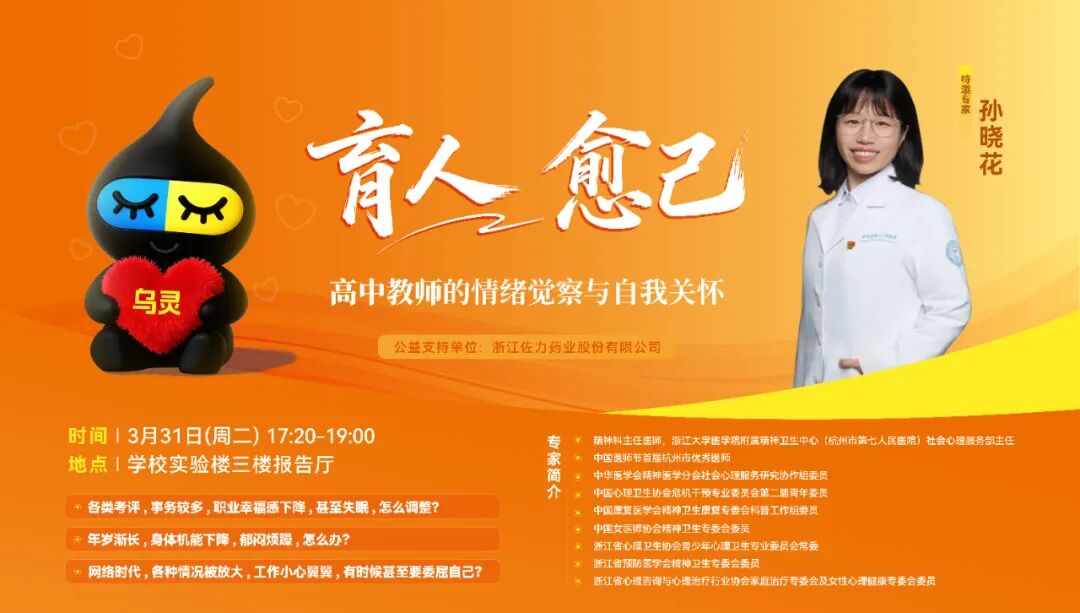 2026年3月31日,由佐力药业公益支持的第三期“走进校园”系列活动再次走进杭州市第九中学。本期活动主要聚焦在高中教师群体,以《育人愈己:高中教师的情绪觉察与自我关怀》为主题,为辛勤耕耘在教学一线的老师们带来一场温暖分享。