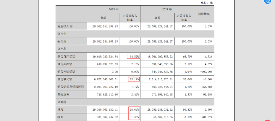 而这种模式决定了它必须把成本控制到极致。它的基地在新疆石河子,那里有便宜的煤炭,天山就自己建电厂发电,度电成本远低于行业平均。这种“家里有矿,电厂自备”的一体化布局,就是它最硬的护城河。不过,这种模式也有代价,就是市场相对封闭。财报显示,天山铝业98.64%的收入都来自国内,海外业务占比微乎其微,这让它很难享受到全球高端市场的高溢价。