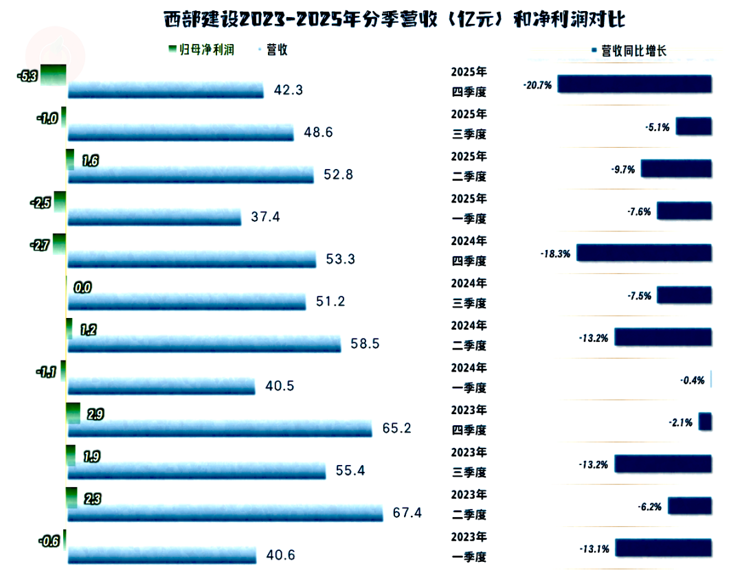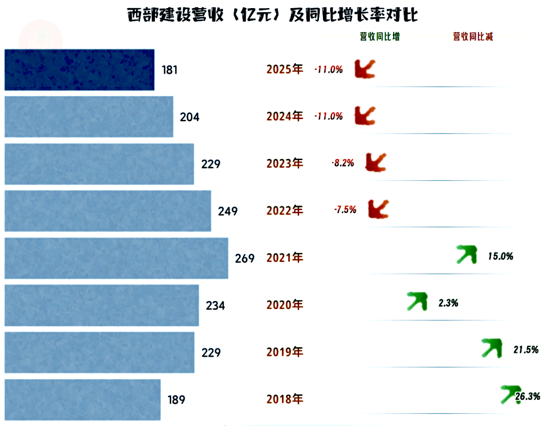 2025年,西部建设的营收同比增长11%,延续了2024年的跌幅。连续四年的跌幅,累计跌去近1/3,经营形势当然是比较严峻的。