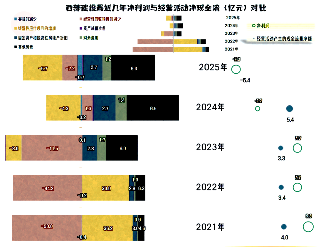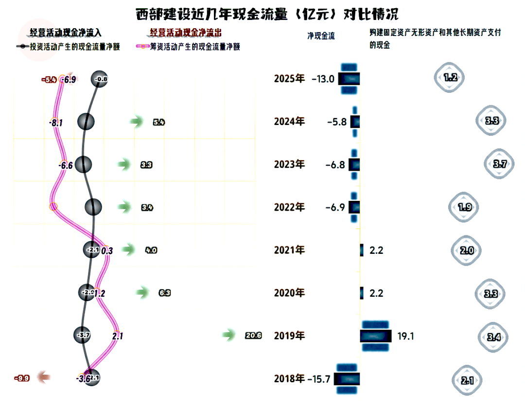 固定资产与“租赁和使用权资产”折旧的规模都不低,理论上维持“经营活动的现金流量净额”为净流入状态的难度并不大。但2025年的西部建设在应收、应付和存货方面,都在多占用资金,再加上亏损,经营活动现金流的表现就比较难看了。