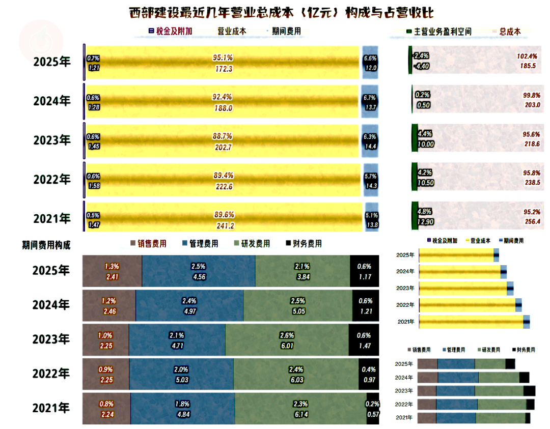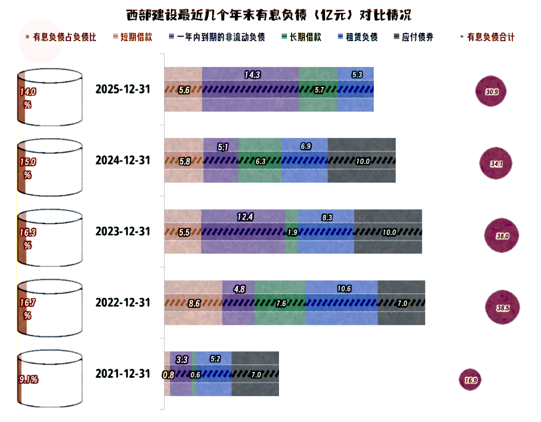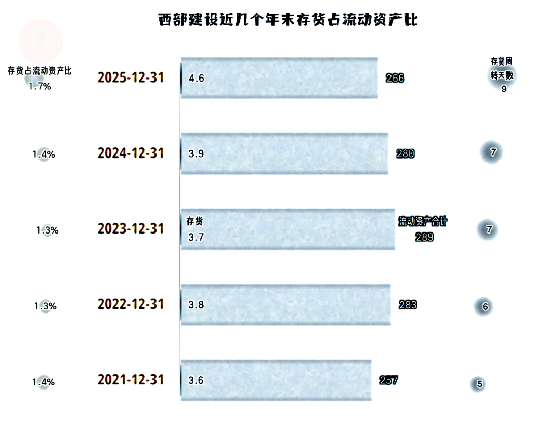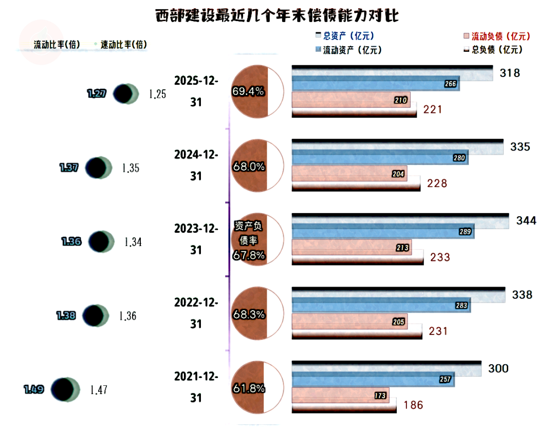 西部建设的长短期偿债能力都很好,2025年末有所下降,暂时影响不大。之所以是这种状态,是因为前些年西部建设持续大额盈利,有条件安排一个兼顾安全与效率的资产负债结构。
