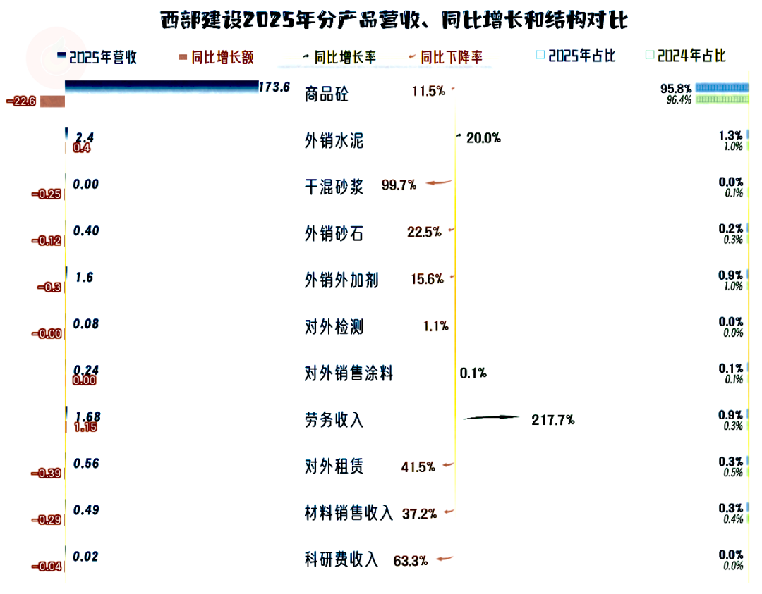 西部建设的营收结构非常复杂,但其实也比较简单,那就是绝对核心的就是“商品砼”业务,另一种通俗的说法叫“商混”。除此之外的业务中,只是“外销水泥”、“外销外加剂”和劳务收入的规模超过了1亿元。2025年也仅有“外销水泥”和劳务收入有所增长,但是,不可能靠这些业务的增长来抵消“商混”的下跌,当然也没法向这些业务去转型。