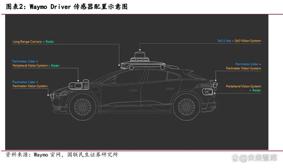 特斯拉引领“端到端大模型 纯视觉”方案。其 FSD 系统采用端到端神经网络架 构,将感知、决策与规划流程进行整合,规避高精地图与冗余传感器依赖,依靠全球 超 600 万辆量产车采集的行驶数据与 35 EFLOPS 的云端算力,持续优化长尾场景处 理能力。最新版 FSD(V13.2.9)进一步引入 36Hz 视频流输入、5 倍训练计算拓展, 降低光子控制延迟并重设控制器,实现更强的环境应对能力和更顺畅、更准确的追踪。 在硬件方面,更新后的 HW4.0 全面取消毫米波与超声波雷达,采用 9 摄像头纯视觉 系统;HW5.0 已在测试中,算力或达千 TOPS 级别。正是基于领先的 FSD 技术,特斯 拉以 Robotaxi 形式运营的改装 Model Y 车型在奥斯汀正式上线,FSD 已经实现了从L2 到 L4 的技术跃迁。 “Waymo Driver”推动 Waymo Robotaxi 商业化落地。“Waymo Driver”系统基 于超过 2000 万英里实路测试和超 200 亿英里仿真数据开发而成,融合了 360°多层 次激光雷达、高动态摄像头与成像雷达等多模态传感器,通过高精度数据融合算法实 现复杂路况下的高置信感知与冗余验证,具备在夜间、恶劣天气及城市高密度交通环 境中稳定运行的能力;在决策控制方面,Waymo Driver 依托大规模机器学习模型, 精准执行行人避让、变道、交叉口通行等高阶操作。依托麦格纳梅萨工厂,搭载 Waymo 开发的计算机、摄像头、雷达、激光雷达传感器等硬件与“Waymo Driver”系统的 Robotaxi 有望实现量产。