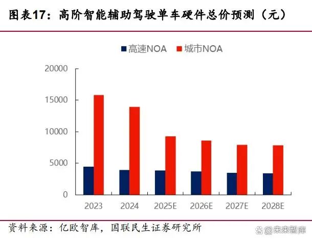 Robotaxi 国内成本加速下行。核心部件如激光雷达已实现国产替代,价格大幅 下降,如感知部件激光雷达、毫米波雷达、摄像头等。以激光雷达为例,截至 2025 年 6 月激光雷达成本相比 2024 年降幅超 50%,单价已下降至一千多元。零部件成本 的大幅优化也推动了高阶智能辅助驾驶成本显著下行,亿欧智库预计2025年城市NOA 单车硬件总价低于一万元,高速 NOA 则有望低于四千元。