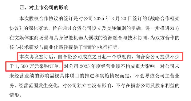 2025年3月,智元与上市公司大丰实业结为战略合作伙伴,双方同样是设立合资公司。彼时,大丰实业承诺在合资公司成立后一个季度内,提供不低于1500万元意向采购订单。