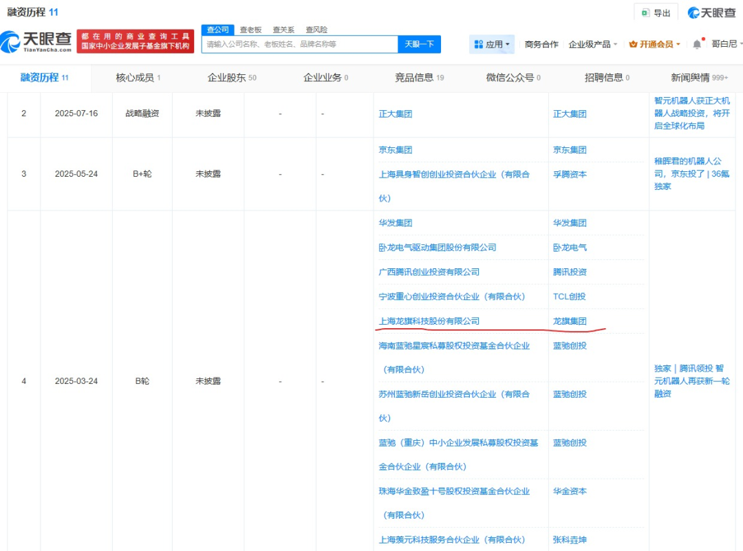 天眼查显示,2025年3月,智元完成B轮融资,该轮由腾讯领投,蓝驰创投等老股东跟投,同时参投名单里还有一个熟悉的新面孔——龙旗科技。天眼查显示,目前龙旗对智元的持股比例约为0.74%。