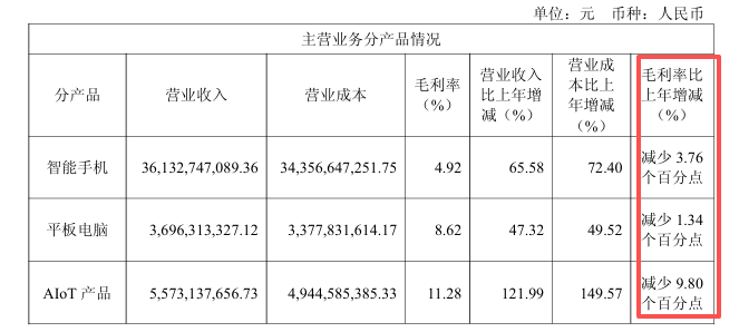 分产品看,2024年,龙旗科技的智能手机、平板电脑和AIoT 产品的毛利率均遭遇不同幅度下滑。尤其作为营收大头的智能手机业务,毛利率仅为4.92%,基本上属于不赚钱状态。