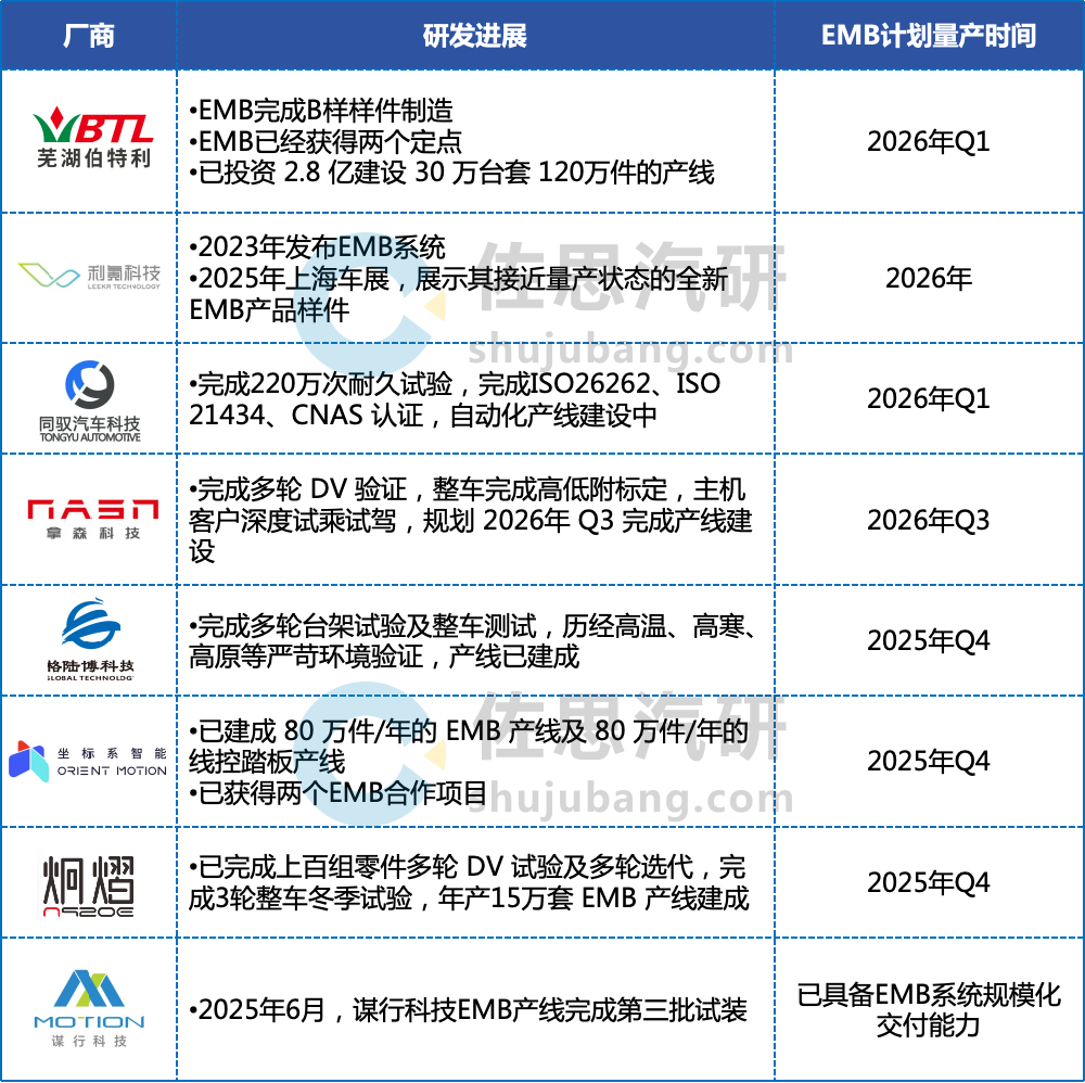2025年,EMB量产进程加速,多家企业已完成EMB产线建设,EMB规划量产时间集中在2025年底到2026年上半年。