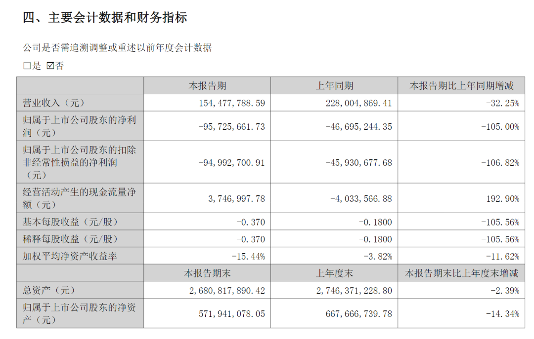 进入2025年,亏损的局面仍在持续。2025年半年度报告显示,公司上半年实现营业收入1.54亿元,同比下降32.25%;归属于上市公司股东的净利润为-9572.57万元,亏损额同比扩大105.00%。