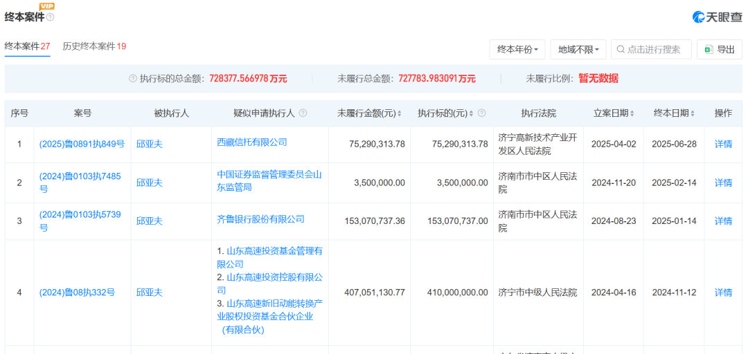 天眼查显示,目前,邱亚夫名下终本案件未履行总余额超过70亿元。