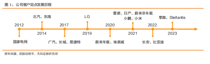 项目储备丰富,多个定点项目陆续进入量产期。在对长城汽车、广汽集团、蔚来汽车、小鹏汽车实现定点项目的量产的基础上,公司又陆续取得比亚迪汉、宋、护卫舰、长安汽车阿维塔E15/E16项目和零跑汽车C01/C11车型的项目定点。