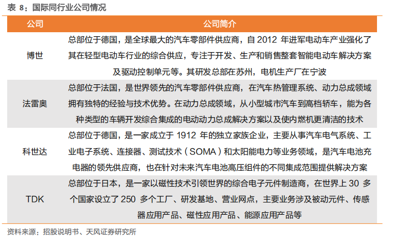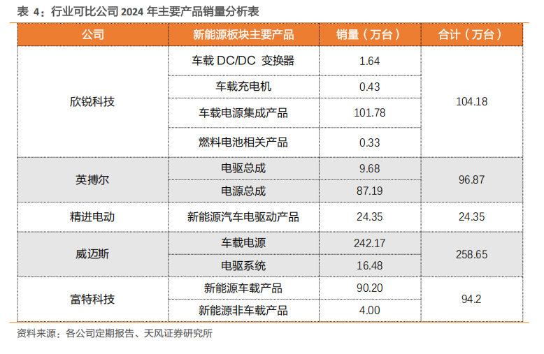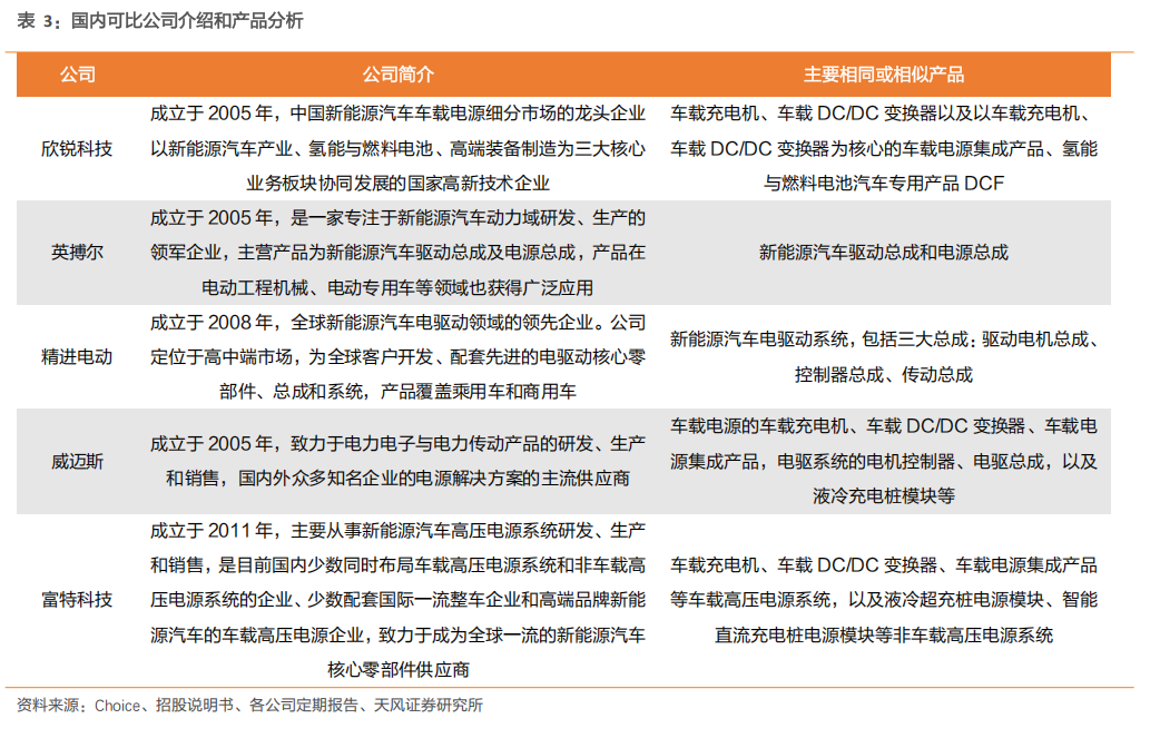 国内同行业5家主要上市公司业务侧重点略有区别。根据公司主营业务、主要产品以及下游主要应用领域或客户群体分析,车载电源及电驱系统主要上市公司包括欣锐科技、英搏尔、精进电动、威迈斯和富特科技。富特科技、威迈斯和欣锐科技目前重点研发量产车载电源集成产品;英搏尔主要开发驱动总成及电源总成多合一集成产品;精进电动重点业务在电驱动系统。