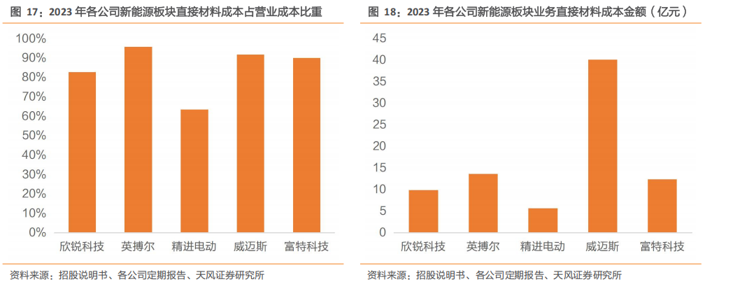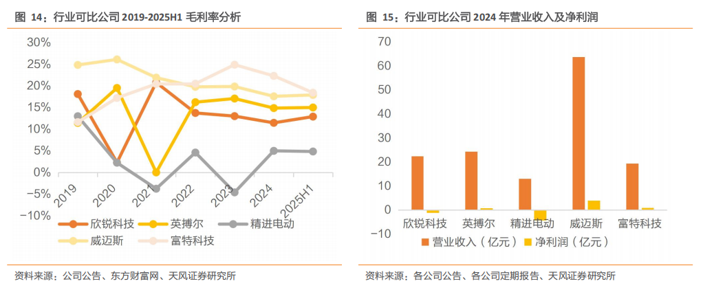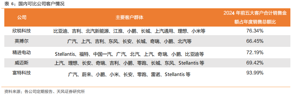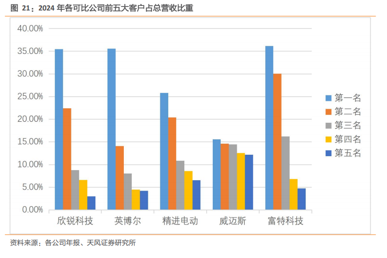 行业主要上市公司客户集中度差异较大,客户结构不一。富特科技客户集中度最高,2024 年前五大客户销售占比达 94%;欣锐科技、英搏尔、精进电动和威迈斯客户集中度处于中等水平,前五大客户销售占比分别为76.34%、 66.45%、72.19%和69.42%。