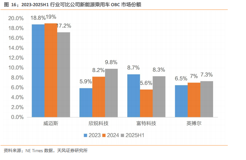 根据NE Times数据,2024年,威迈斯在中国新能源乘用车OBC装机量的市场份额为19%,销量增至199.66万套,排名第二;欣锐科技为8.2%,销量86.41万套,位居第三位;英博尔7%,销量72.94万套,位居第四;富特科技为5.6%,销量58.47万套,同比增长1.4%,总装机量排名第六。2025年上半年,威迈斯以17.2%的市场份额,89.02万套的销量稳居第二;欣锐科技为9.8%,销量50.76万套,位居第三;英博尔为7.3%,销量37.61万套位居第五;富特科技超越英博尔和特斯拉,以8.3%的市场份额,42.85万套,位次上升至第四位,实现中高端车型助力量价齐升。