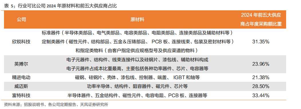 行业主要上市公司供应商集中度总体水平相近,芯片等原材料对进口依赖度高。精进电动和英搏尔前五大供应商集中度较低,2024年前五大供应商占比分别为21.38%和23.96%。欣锐科技、威迈斯和富特科技前五大供应商集中度较高,占比分别为31.35%、28.50%和33.44%。