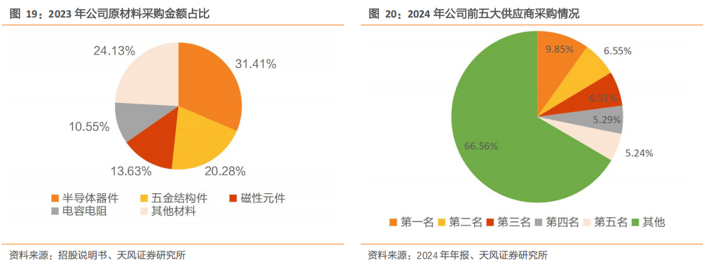 富特科技生产所需的主要原材料包括半导体器件、磁性元件、五金结构件、电容电阻、PCB板及连接器等。2024年,公司前五大供应商采购高度集中,合计占比超过30%。截至2023年,半导体器件和磁性元件等核心物料采购成本仍呈上升趋势,两类产品采购单价已由2020年的1.71元/件、3.11元/件分别提升至2023年的2.60元/件和4.29元/件,反映出原材料价格持续上涨带来的成本压力。