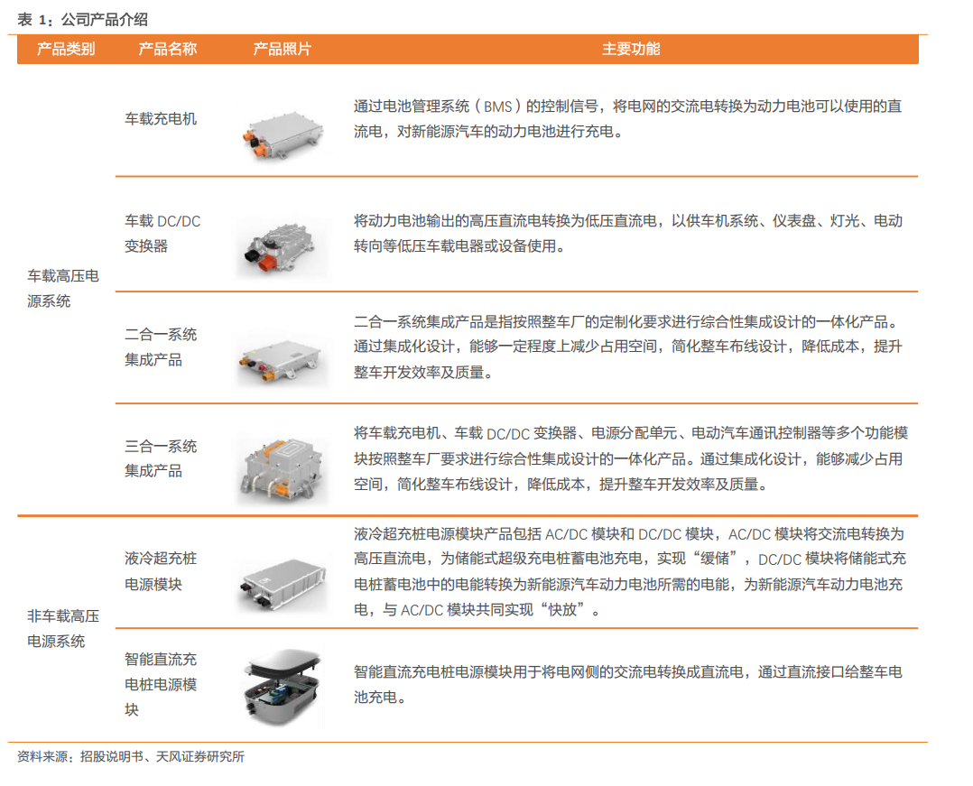 公司主要从事新能源汽车高压电源系统研发、生产和销售。主要产品包括车载充电机(OBC)、车载DC/DC变换器、车载电源集成产品等车载高压电源系统,以及液冷超充桩电源模块、智能直流充电桩电源模块等非车载高压电源系统。其中车载高压电源系统收入占比达90%以上。