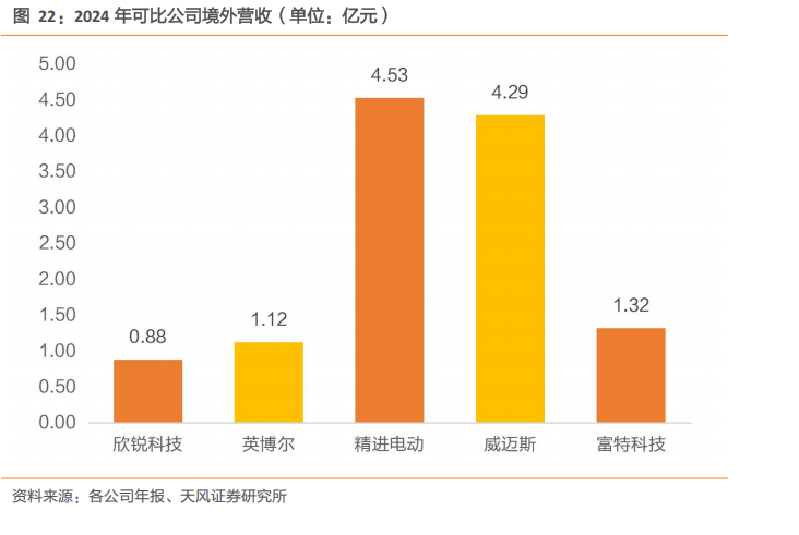威迈斯在全球市场竞争中表现积极,已向Stellantis集团批量供应车载电源集成产品,并获得雷诺、阿斯顿马丁、法拉利等海外车企定点,成为中国本土最早实现向国际知名车企批量出口的供应商之一。2024年境外营业收入4.29亿元,较2023年境外应收额6.68亿元有所减少;境外毛利率25.86%,高于境内毛利率。