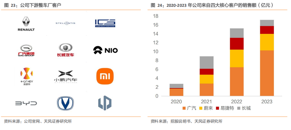现有客户保持黏性,销量持续增长。公司已成为广汽集团、蔚来汽车、长城汽车、易捷特、小鹏汽车等客户的主要或独家供应商,与主要客户合作关系保持稳定。随着2024年内该等客户整车产销量的不断增长,公司来自该等客户的产品收入亦将相应增长。2020年-2023年,公司来自核心客户广汽汽车的销售额从1.61亿元上升至10.31亿元,来自蔚来汽车的销售额从0.06亿元上升至3.7亿元。优质的客户资源优势奠定了公司的市场地位,公司车载高压电源系统在国内新能源乘用车市场的占有率始终位居前列。