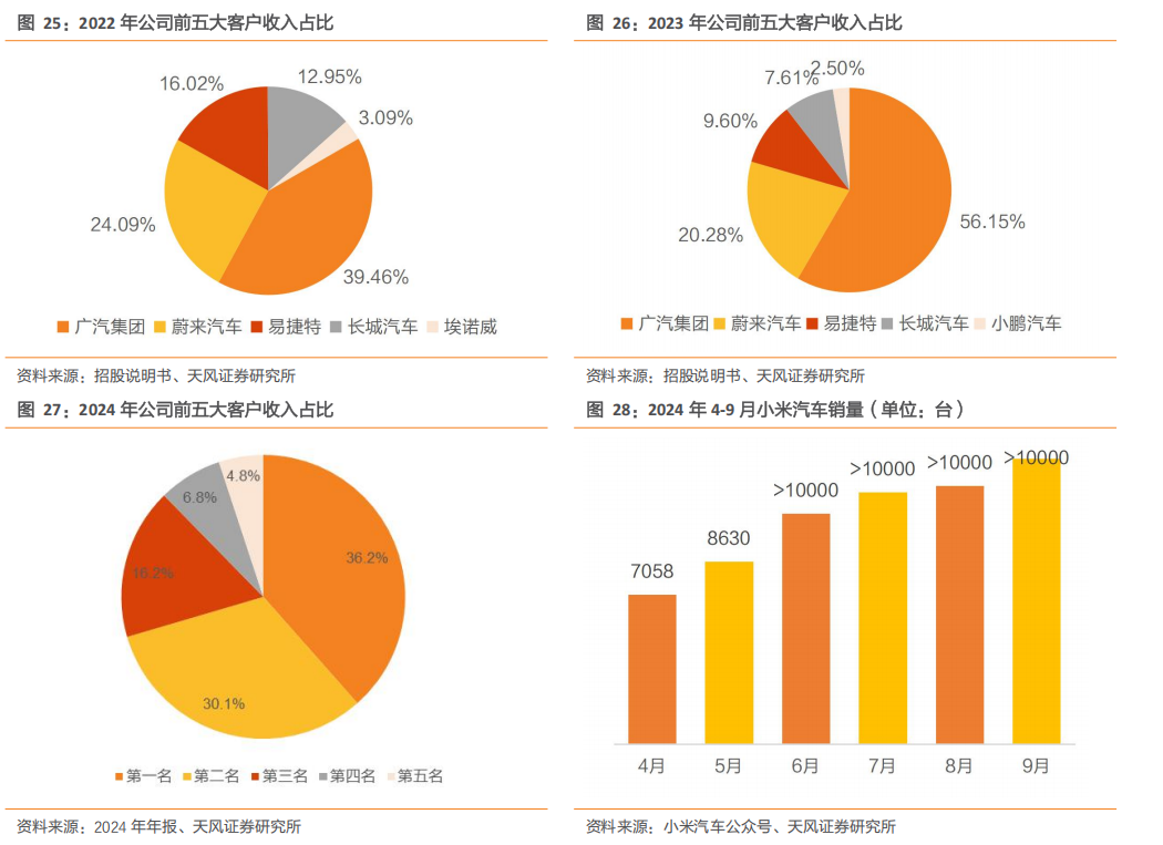 2024年第一季度,公司实现对小米汽车配套项目量产,2024年H1营收中小米汽车占比11.17%,成为公司前五大客户之一。2024年3月Xiaomi SU7系列正式发布,2024年小米汽车共交付13.69万辆Xiaomi SU7系列汽车。2025年6月,小米汽车的首款SUV产品Xiaomi YU7系列正式发布,开售18小时,锁单量突破24万台。随着小米汽车的产能不断爬坡,公司收入亦将相应增长。2024年第三季度,公司配套比亚迪汽车汉DMI和宋L车型、蔚来子品牌乐道汽车相关车型等实现量产并成功上市,带动公司收入在下半年实现增长,进一步促进公司客户结构的优化。