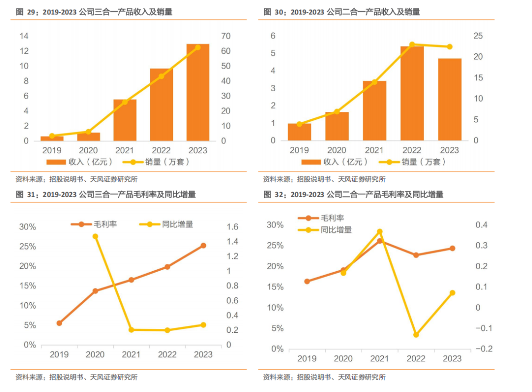 集成化深入发展,带来持续营收增长。三合一系统集成产品相较二合一系统集成产品新增电源分配单元,能更好满足客户的集成化需求,顺应行业技术的发展趋势,带来营收进一步提升。公司三合一产品占主营业务收入占比不断增加,2021-2023年分别为57.89%、58.84%和71.00%。2019-2023年,公司三合一产品收入从0.64亿元增长至13.0亿元,销量从3.42万套增长至62.55万套,呈现快速增长趋势。