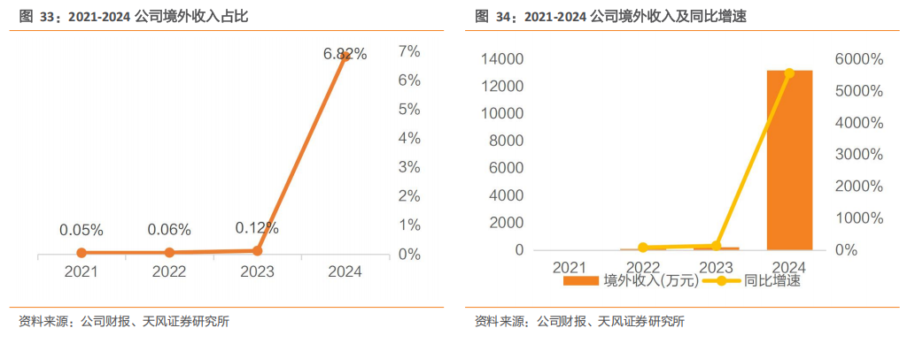 欣锐科技在巩固国内客户基础上,持续拓展合资品牌与国际整车厂商合作,已实现对本田、现代、奔驰、沃尔沃等品牌的批量配套。2024年境外营收0.88亿元,较2023年境外营收额2.34亿元,有所下降;境外毛利率56.08%,大幅领先国内所有地区。