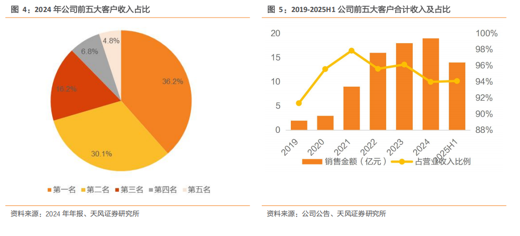 公司客户基础深厚,拥有众多头部优质客户。2024年公司前五大客户收入占比93.99%,最大客户收入占比36.16%。公司客户集中度较高,主要系下游整车产业较为集中的竞争格局、公司重点开发服务优质客户的市场策略以及部分客户的定点项目尚未量产所致。目前公司已相继取得雷诺汽车、日产汽车、小鹏汽车、小米汽车、比亚迪、长安汽车、LG等优质客户的项目定点,随着产品矩阵的丰富、客户定点项目的量产和爬坡放量,客户集中度问题预计将会得到有效改善。