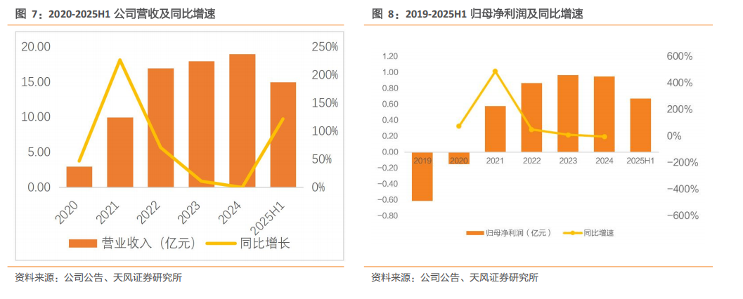 公司营收过去几年呈现快速增长,归母净利润至高点后保持平稳。受益于我国新能源汽车产销量的持续增长以及公司客户群体与配套项目的不断拓展,公司经营规模快速扩大。2020年至2024年,营业收入从2.95亿元增长至19.34亿元,收入快速增长。其中,2021年营收同比大幅增长227.11%,归母净利润同比增长489.14%。2024年实现营业收入19.34亿元,同比增长5.39%,实现归母净利润0.95亿元。2025年上半年,公司实现营业收入14.74亿元,较上年同期增长122.64%,得益于公司已与多家头部车企建立稳定的合作关系以及新增客户项目的稳步导入与量产交付。