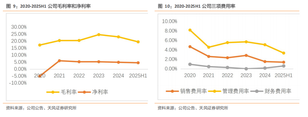 规模化优势显现,费用端优化趋势明确。通过加强运营管控、提高运营效率等措施,2022-2024年公司期间费用率呈稳中有降趋势,其中2023年期间费用率约20.07%,2024年期间费用率进一步降至17.16%,2025年上半年期间费用率为13.57%,体现业务规模化下的费用管控成效。
