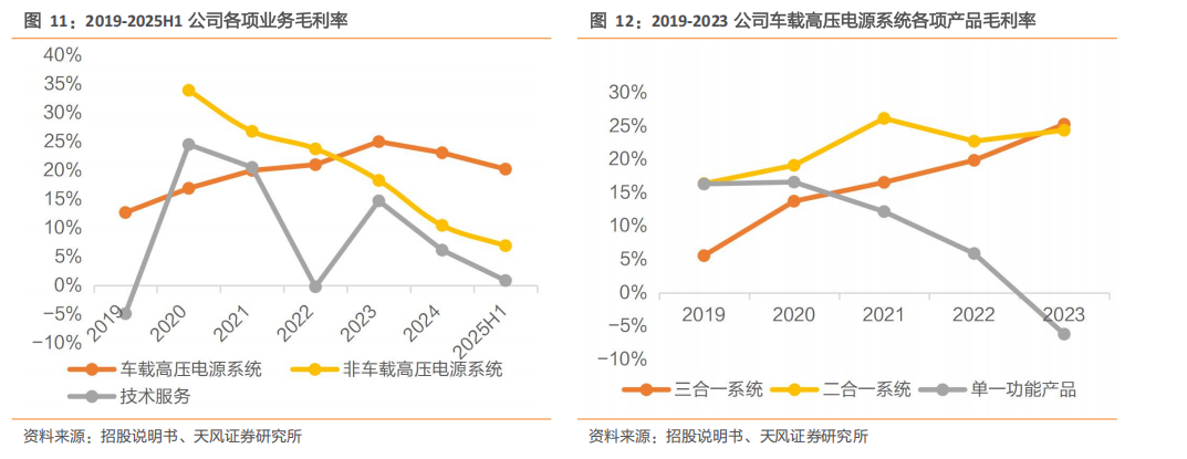 三合一系统集成产品的毛利率逐年上升带动公司主营业务毛利率增长。2021年-2023年,车载高压电源系统毛利分别占公司毛利总额的92.85%、94.43%和97.75%,是公司毛利的主要来源。得益于公司原材料采购价格下降、生产管控力度加强、规模效应显现以及产品结构改善、收入结构向主力机型集中,三年间三合一产品毛利率分别为16.54%、19.85%和25.26%,呈逐年增长趋势。2022年受产品结构及成本上升等因素影响,公司二合一产品毛利率有所下降,后经生产管理水平提升、生产工序优化等在2023年实现毛利率增长。此外,受项目双方多方面因素影响,技术服务业务项目之间毛利率水平存在差异,导致波动水平较大。2023年,因取得已量产项目的开发费用补偿,技术服务毛利率有所回升。