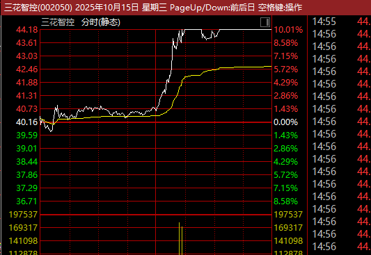 10月15日午后,三花智控A股股价突然直线拉升,盘中触及涨停。同时,公司港股也同步拉升,盘中一度涨超13%。截至15日收盘,公司A股股价报收44.18元/股,涨幅为10.01%,总市值达1860亿元。港股报收于39.50港元/股,涨幅为12.92%。