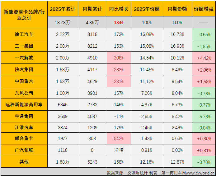上表可见,2025年1-9月份,新能源重卡累计销售13.78万辆,同比累计增长184%,累计增幅较8月过后( 180%)扩大4个百分点。具体到新能源重卡生产企业来看,大多数企业都实现翻倍增长。这其中,解放、陕汽、重汽、福田和联合重卡等企业,1-9月累计销量同比分别大增了308%、283%、231%、315%和542%,实现翻倍增长的同时也跑赢1-9月新能源重卡市场“大盘”,广汽领程是净增长。