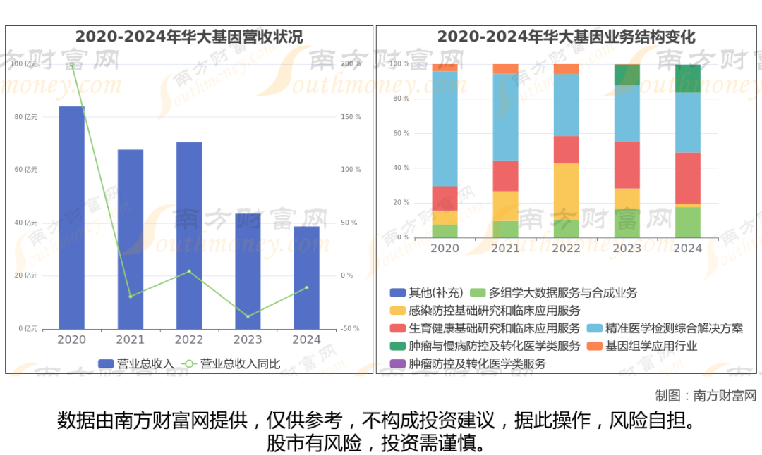 据年报数据显示(如上图),华大基因过去一年实现营业收入38.67亿,同比增长-11.1%,近5年复合年增长率-17.62%。
