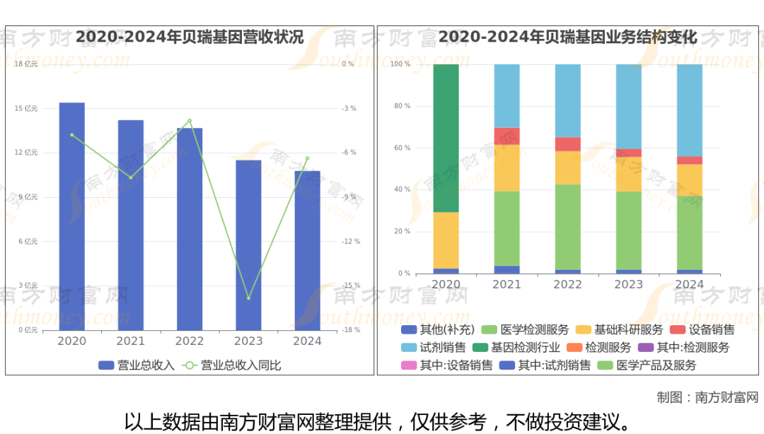贝瑞基因年报数据显示(如上图),2024年实现营业总收入10.78亿,同比增长-6.36%,近5年复合年增长率-8.53%。