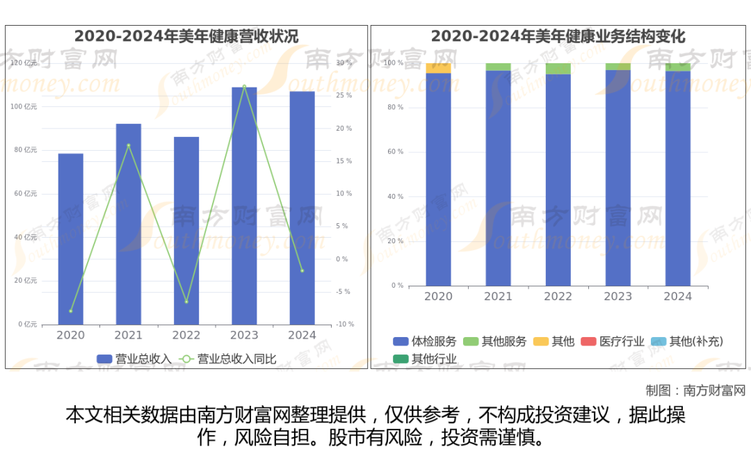 (如上图)2024年美年健康公司营业总收入107.02亿,同比增长-1.76%,近五年复合增长率为8.06%。